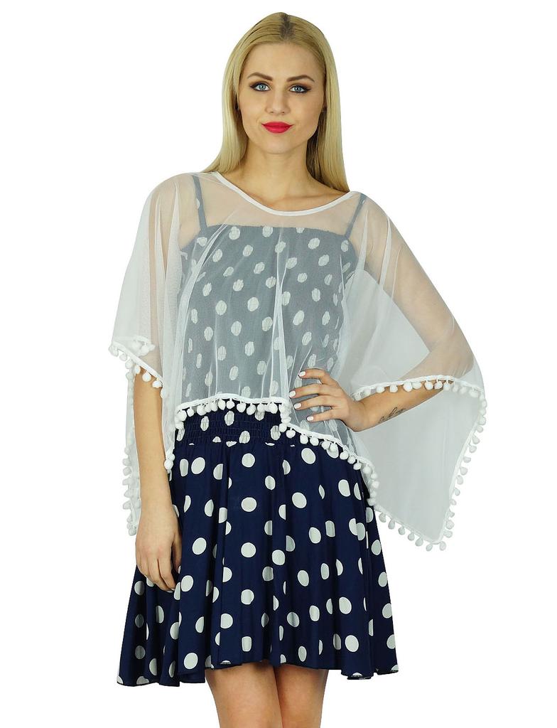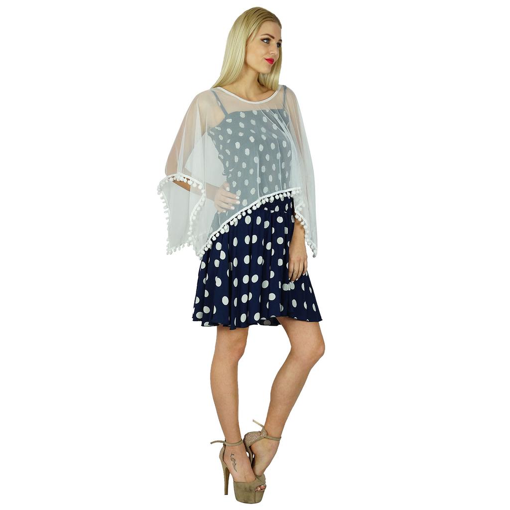 Bimba приготовила для вас это очаровательное дымчатое короткое платье синего цвета.. Это платье изготовлено из мягкой и эластичной вискозной ткани.. Белый горошек добавляет очарования платью.. Но лучшая особенность этого платья - это пончо из сетчатой ткани, которое делает платье незаменимым продуктом.