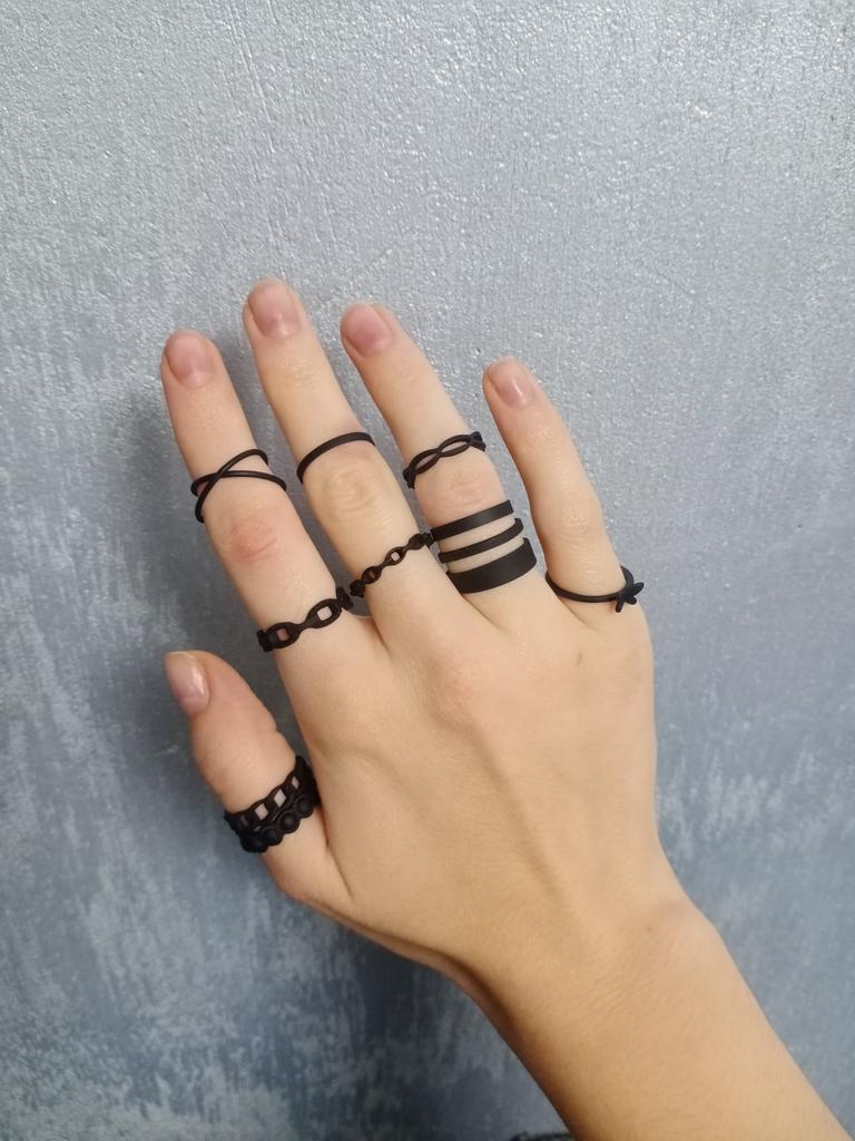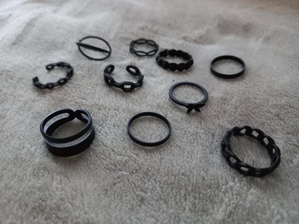 Хорошие колечки. Много. На небольшой размер, примерно 15-17 Два из них регулируемые. Мне понравилось Сделаны вроде бы из... пластика? Или что-то в этой категории. Краска начала слазить уже после первого применения, так что. даааа