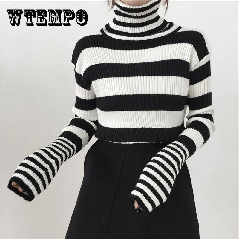 Свитер женский, водолазка, трикотаж, черно-белый полосатый пуловер, корейский тонкий топ, модный свитер, осенне-зимняя мода — купить товар онлайн с бесплатной доставкой по всему миру!