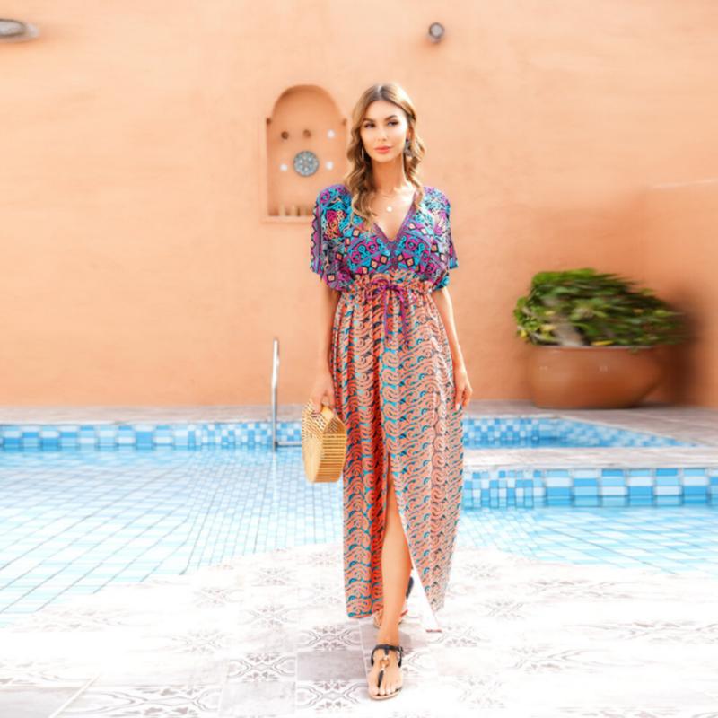 Накидки на бикини, богемное кимоно с принтом, зеленая туника, женская пляжная одежда больших размеров, Глубокий v-образный вырез спереди, открытое макси-платье, купальный костюм, накидка — купить товар онлайн с бесплатной доставкой по всему миру!