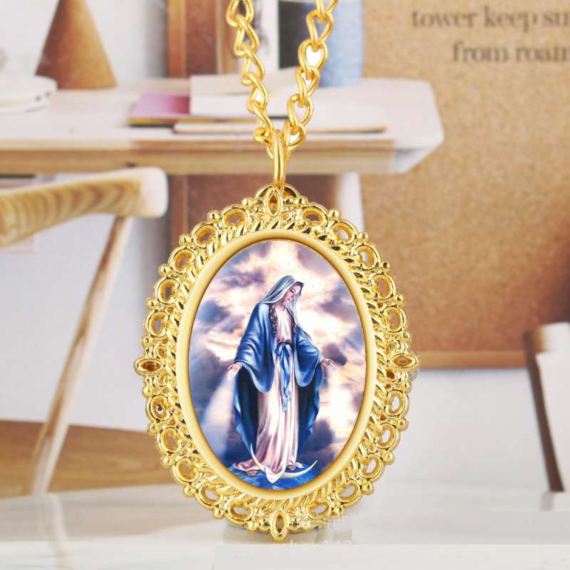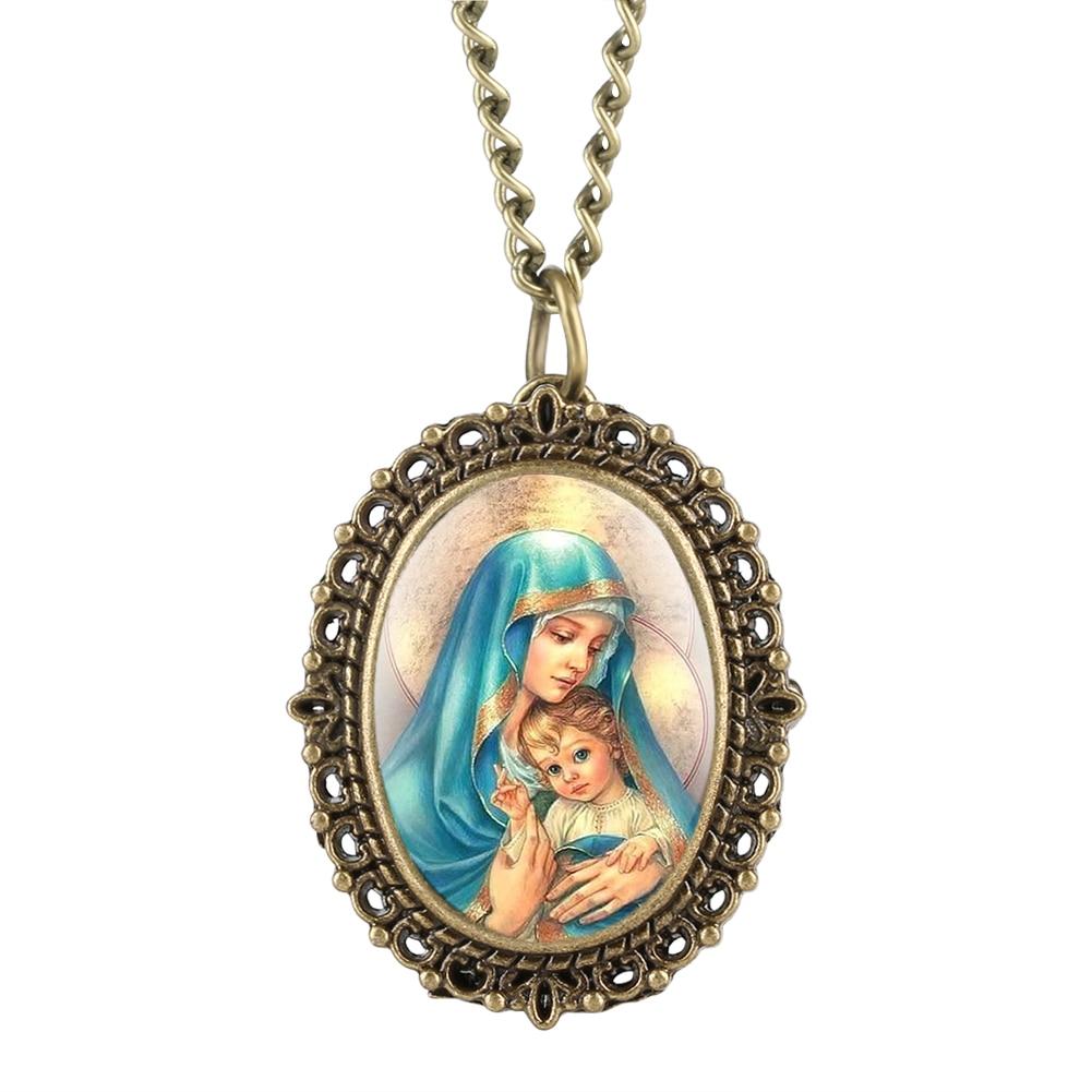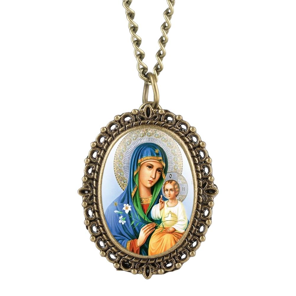Бронзовые овальные карманные часы для женщин, карманные часы с узором Девы Марии для унисекс, аналоговые кварцевые карманные часы с ожерельем