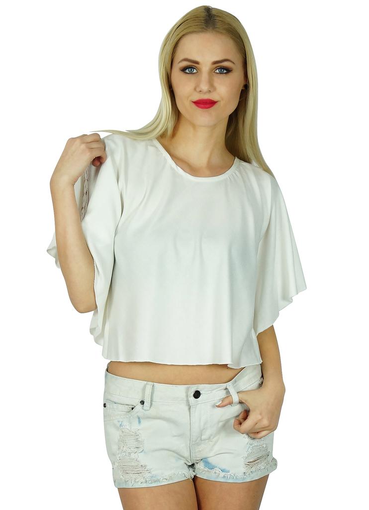 Это укороченный топ из вискозы белого цвета с рукавами-кимоно.. Сплошной рисунок топа и круглый вырез делают укороченный топ изящным нарядом, который можно сочетать как с нашими джинсами, так и с вашими шортами.. Возьмите этот укороченный топ Bimba и сочетайте его со своими модными аксессуарами.