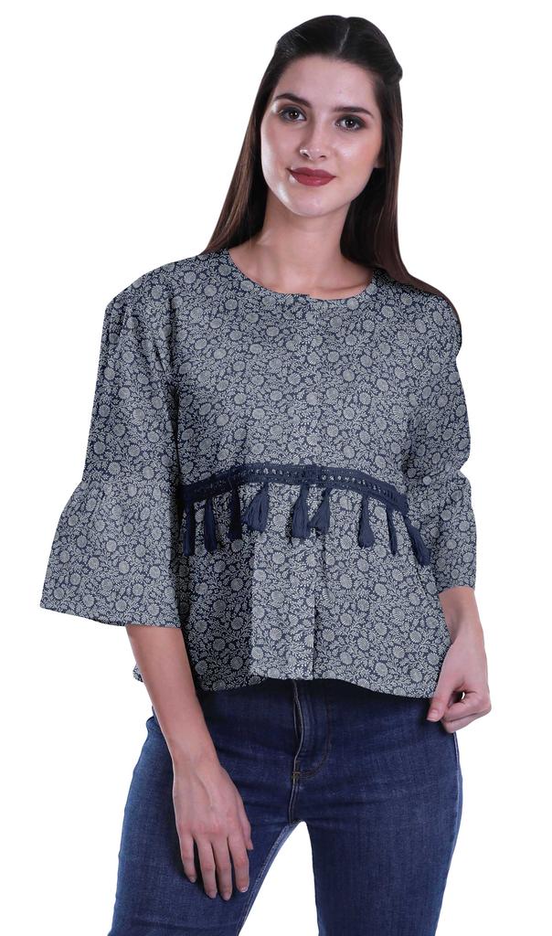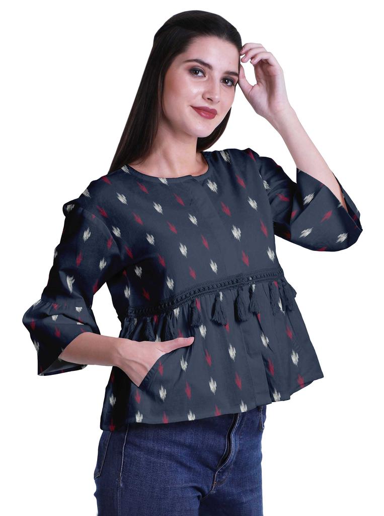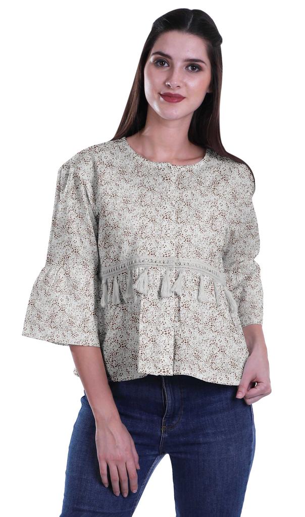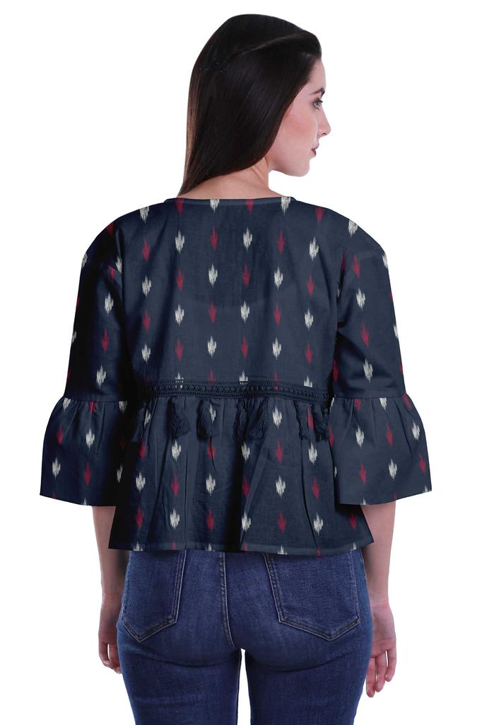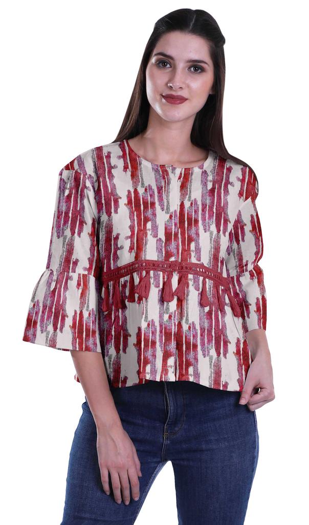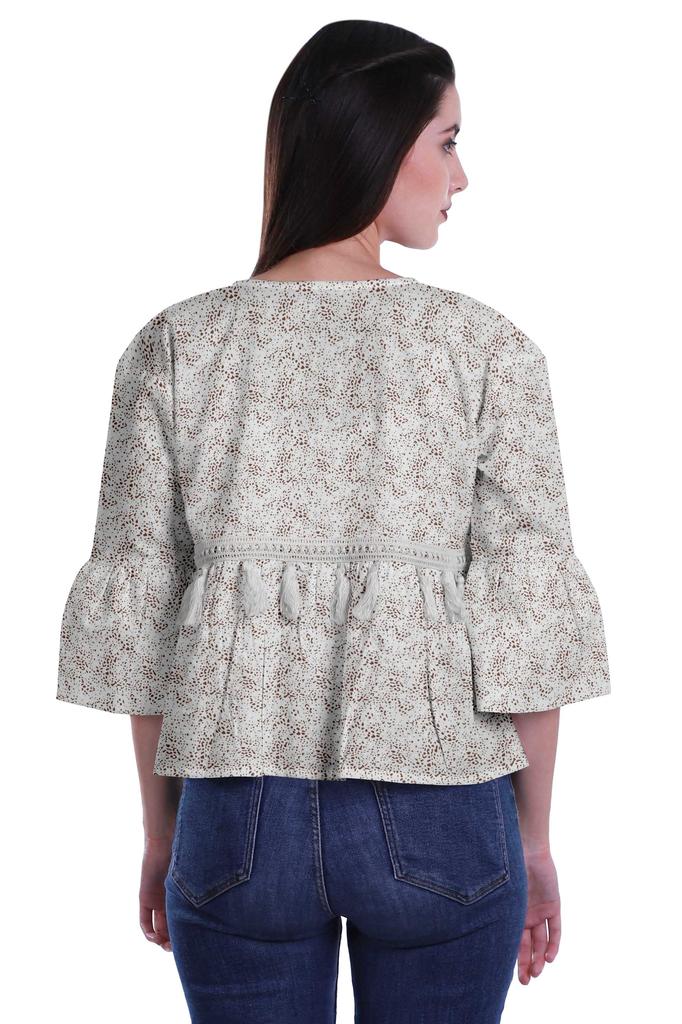 * Сделанный из эластичной хлопковой ткани, этот топ из мумийи с круглым вырезом, 3 рукавами-клешами 4ThA, расклешенный низ, открытая передняя планка, кружево с кисточками на талии и два небольших передних кармана делают его визуально привлекательным.. Этот топ в стиле бохо можно носить с джинсами, чтобы выглядеть наилучшим образом.