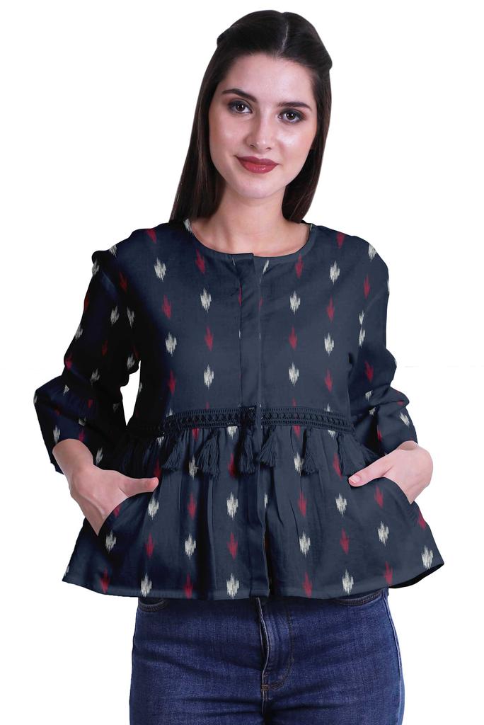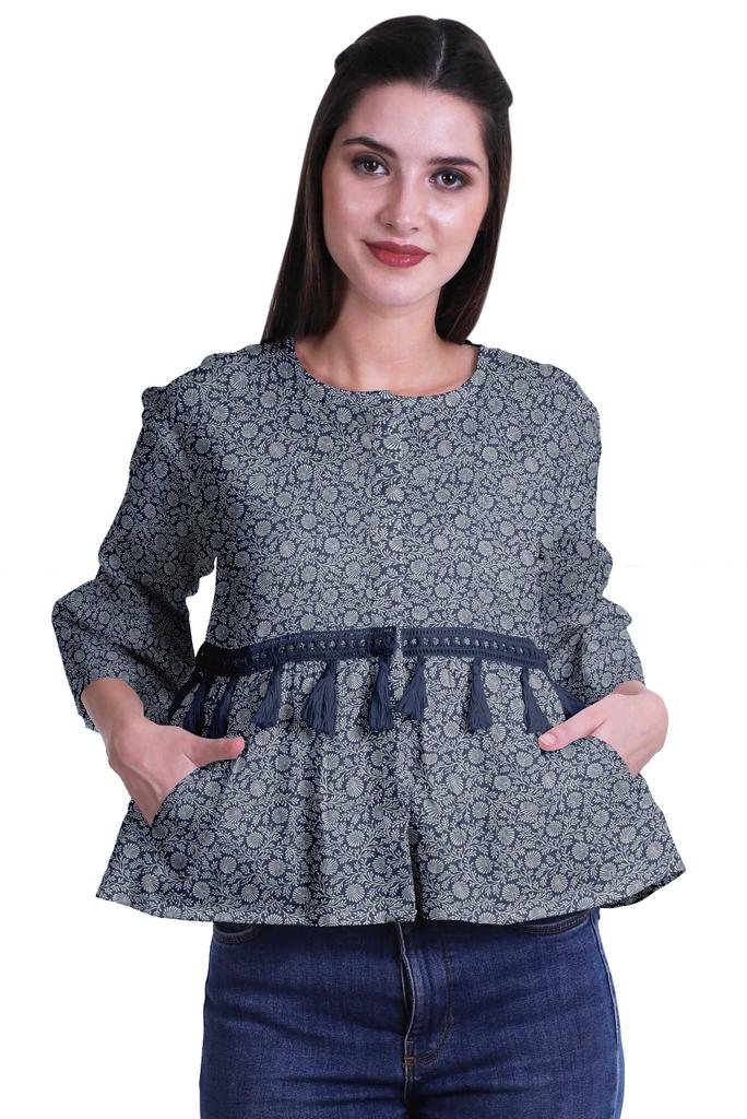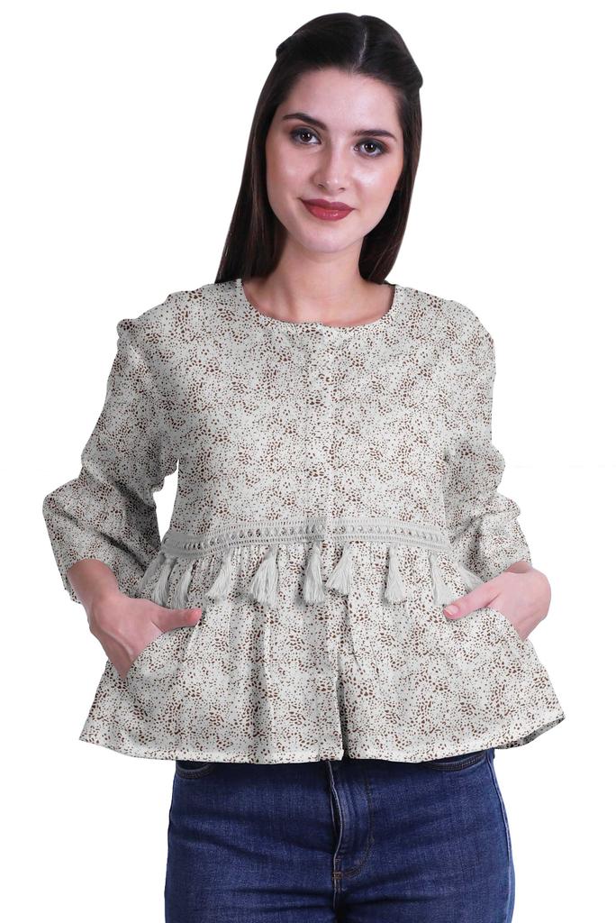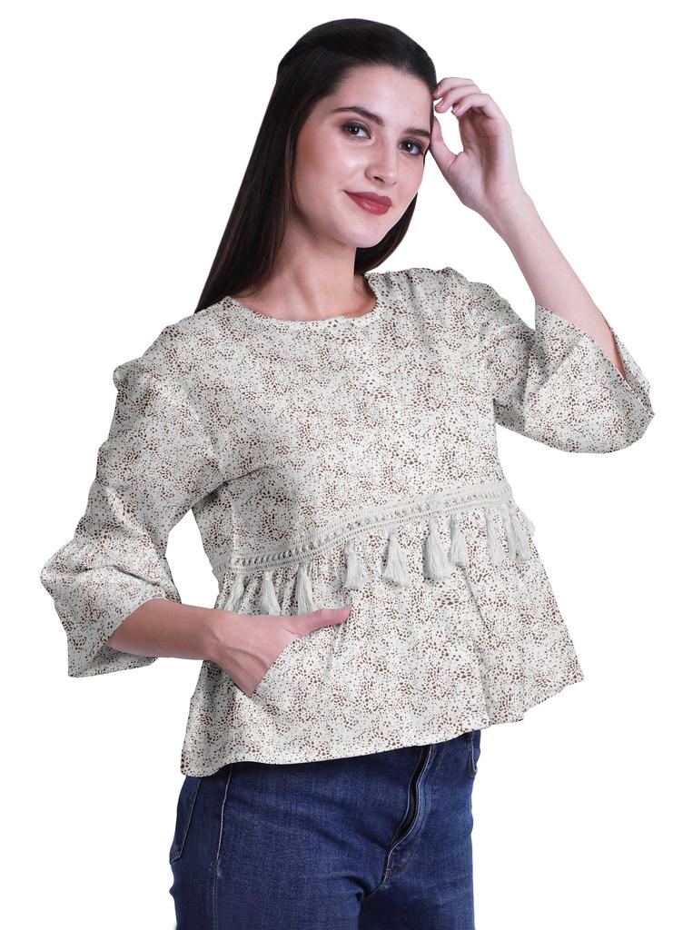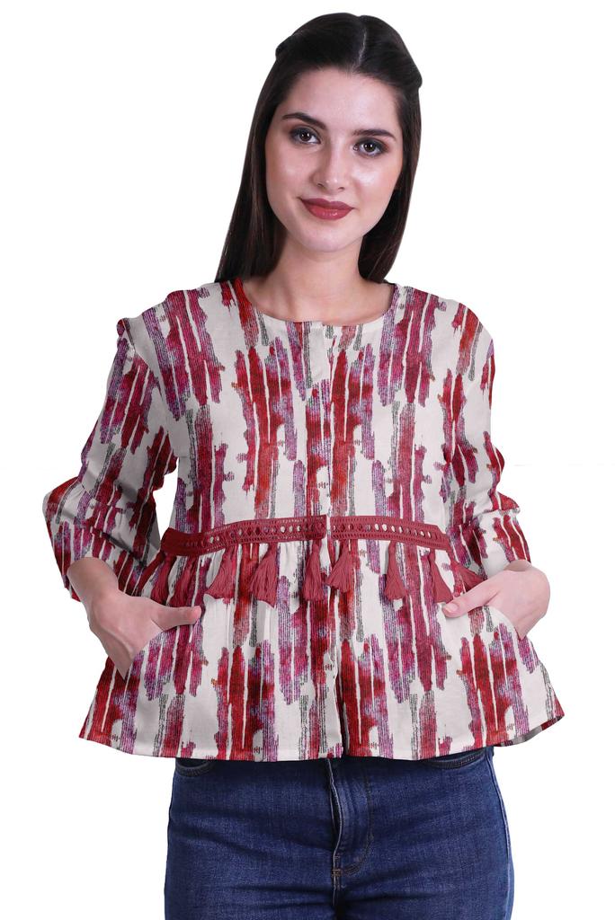 * Сделанный из эластичной хлопковой ткани, этот топ из мумийи с круглым вырезом, 3 рукавами-клешами 4ThA, расклешенный низ, открытая передняя планка, кружево с кисточками на талии и два небольших передних кармана делают его визуально привлекательным.. Этот топ в стиле бохо можно носить с джинсами, чтобы выглядеть наилучшим образом.