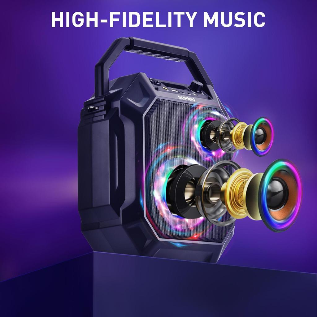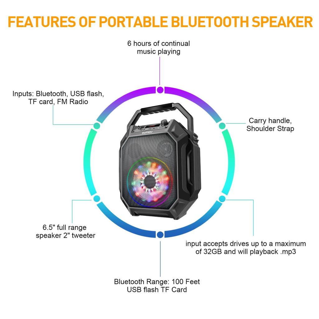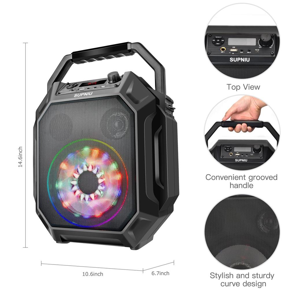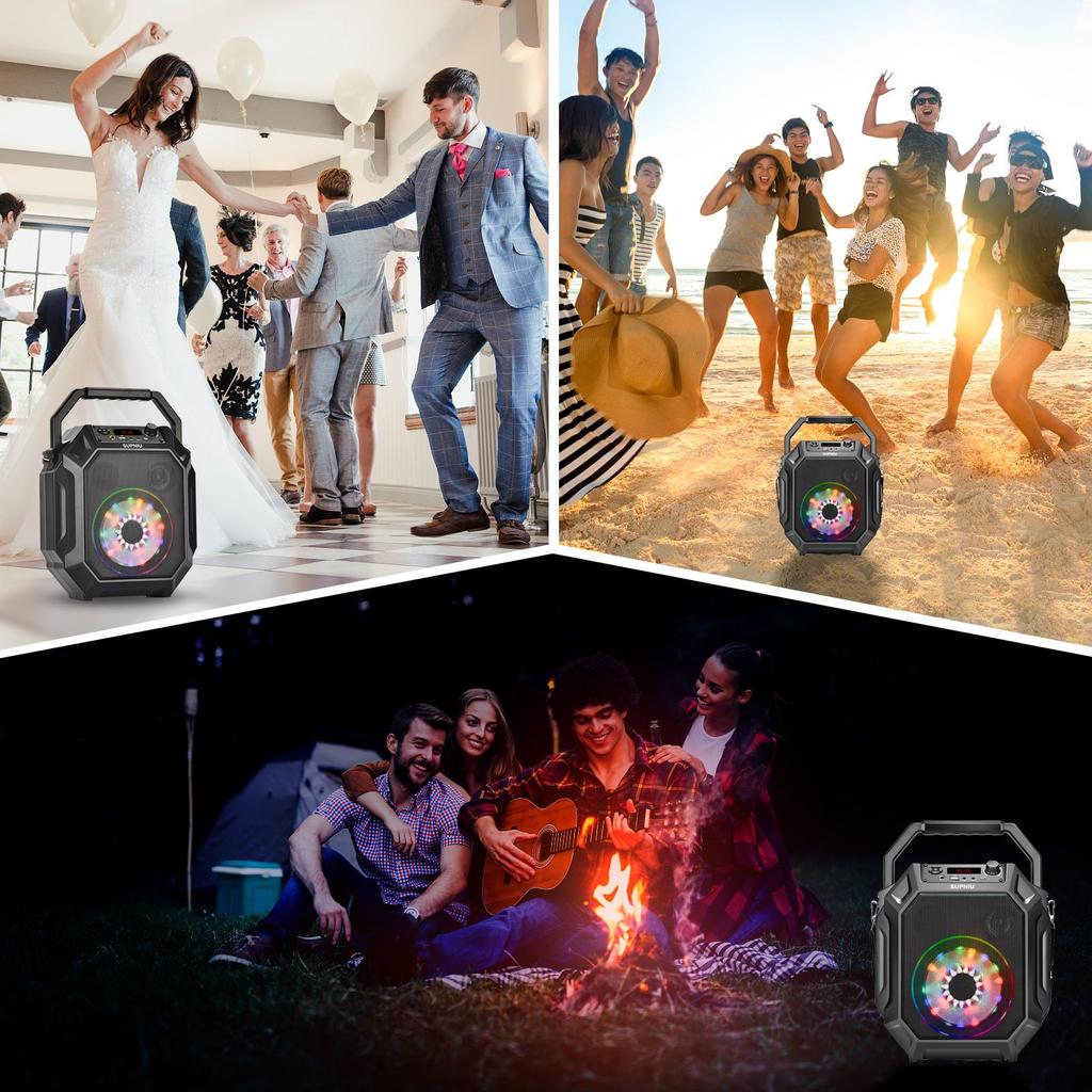 [Динамики Bluetooth со светом] — Красочные мигающие огни: беспроводной динамик Bluetooth имеет мигающие RGB-индикаторы, которые танцуют под музыку., а мигающий строб делает музыку более динамичной и привлекательной. Этими прохладными красочными огнями можно управлять. Вы можете наслаждаться огнями для домашней вечеринки, пляжа, кемпинга или путешествий на свежем воздухе.