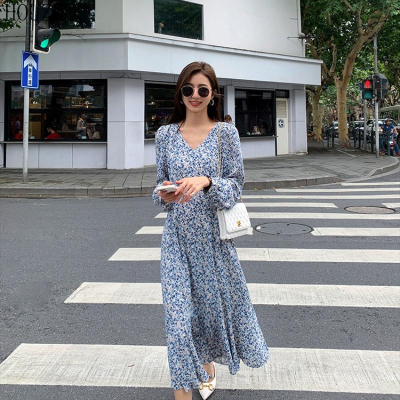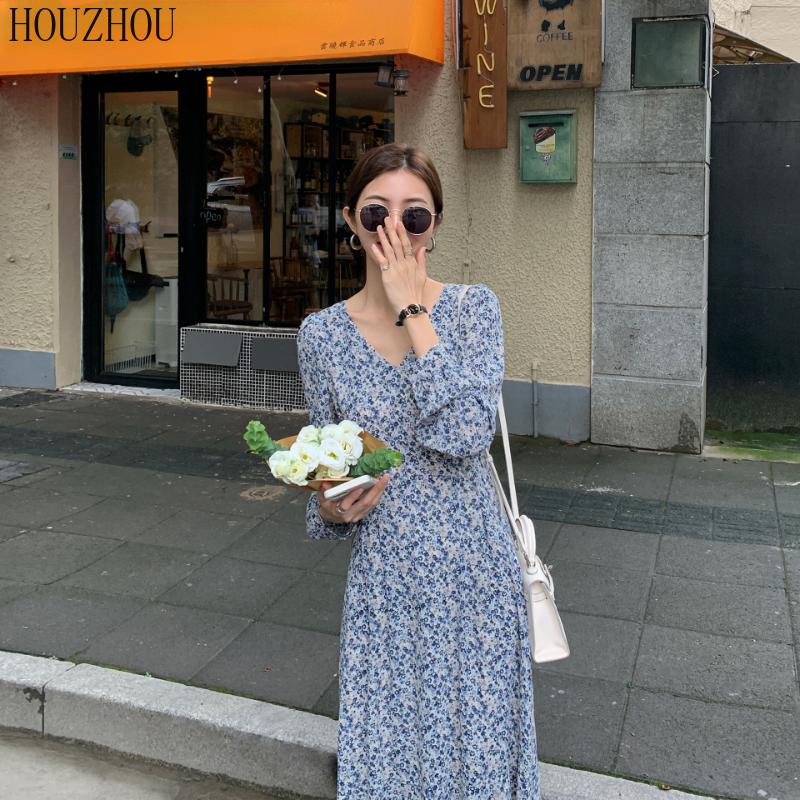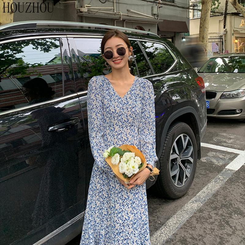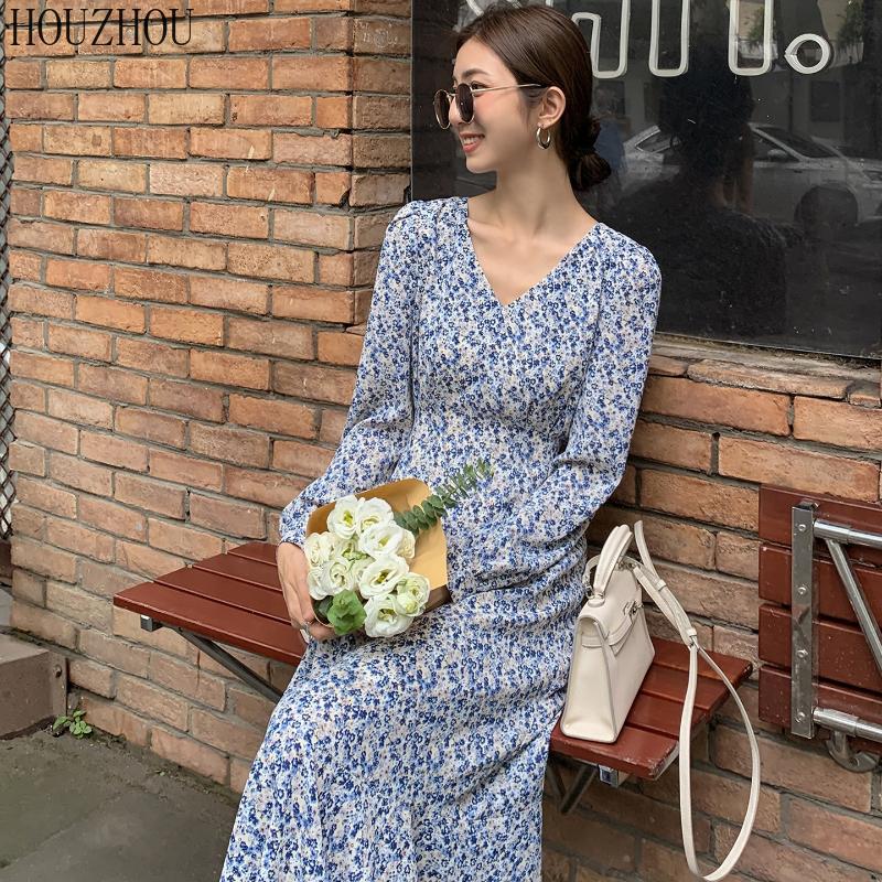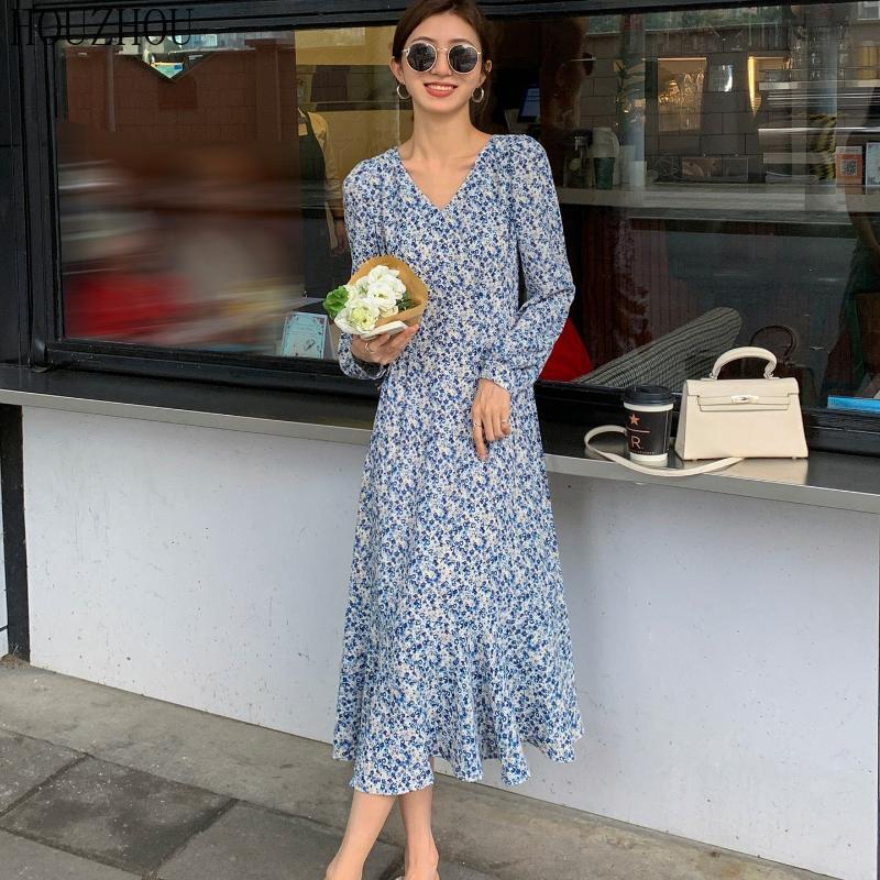 HOUZHOU Цветочное платье женское французское с v-образным вырезом с длинным рукавом корейское элегантное шикарное шифоновое платье с рыбьим хвостом