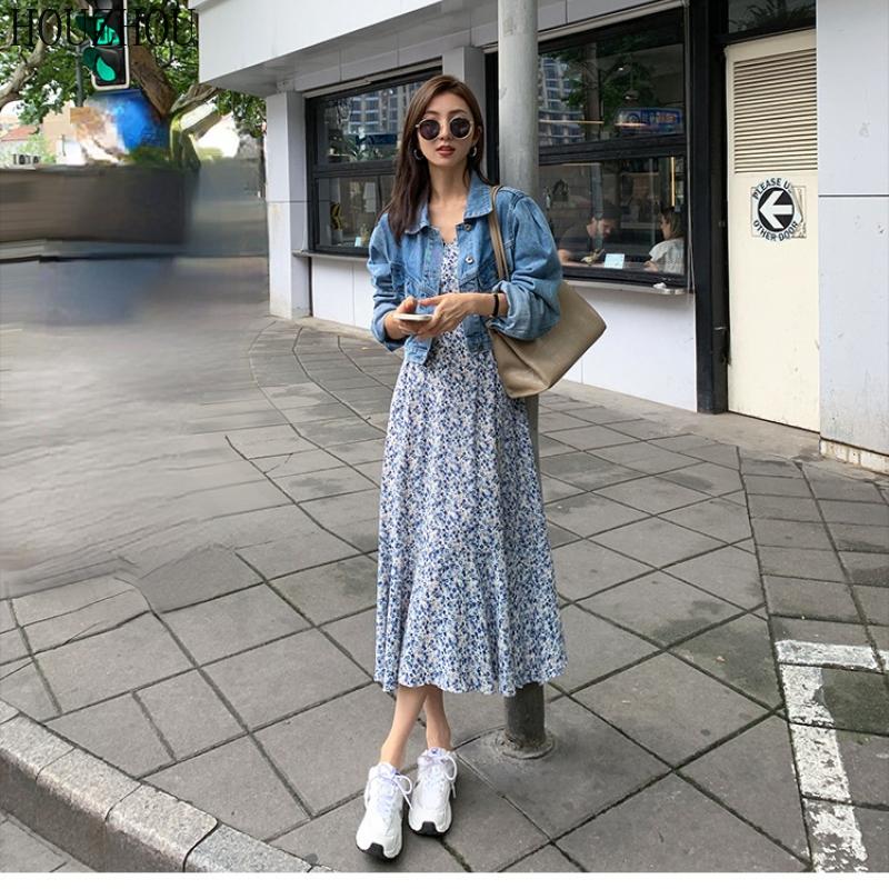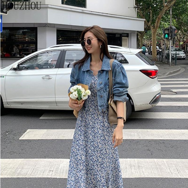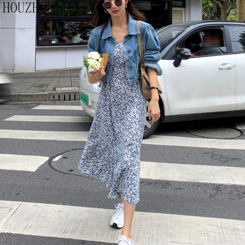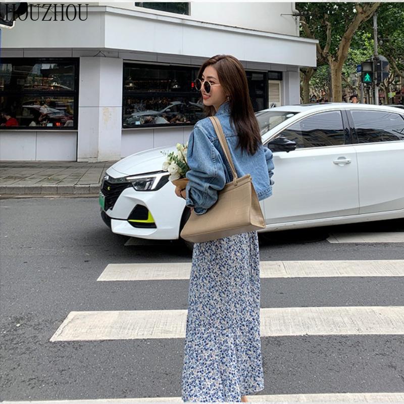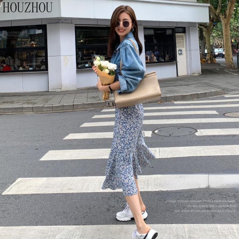 HOUZHOU Цветочное платье женское французское с v-образным вырезом с длинным рукавом корейское элегантное шикарное шифоновое платье с рыбьим хвостом