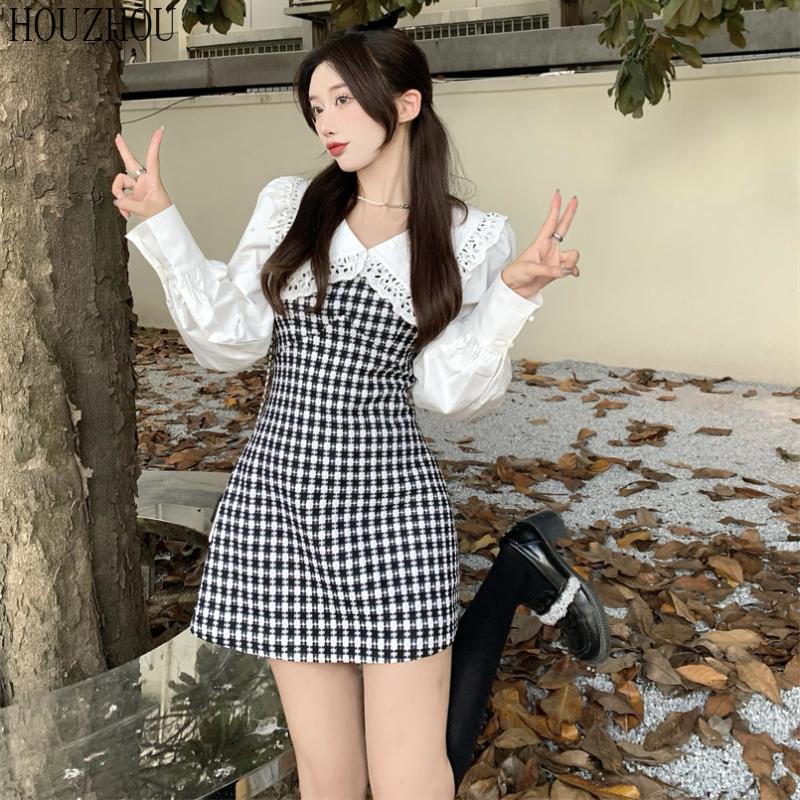 HOUZHOU Платье в клетку с кукольным воротником, женское платье из двух частей, милое элегантное шикарное платье феи в корейском стиле — купить товар онлайн с бесплатной доставкой до всему миру!