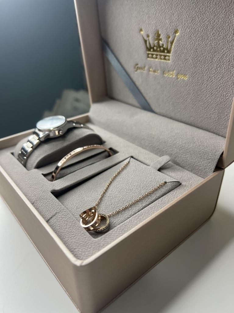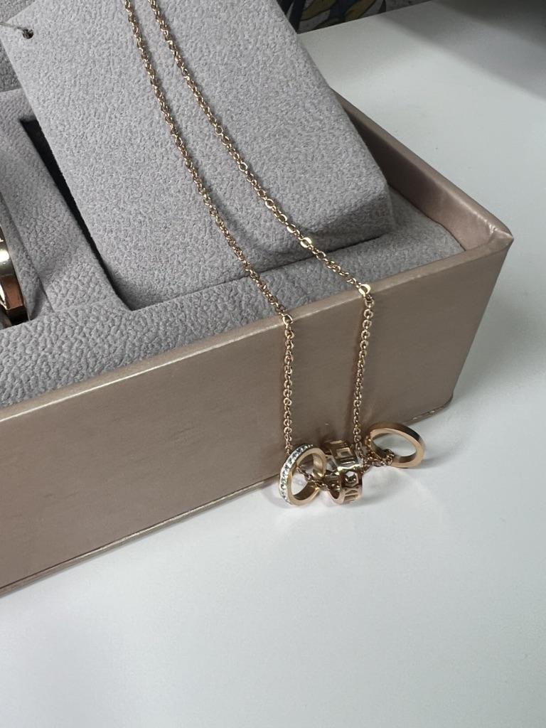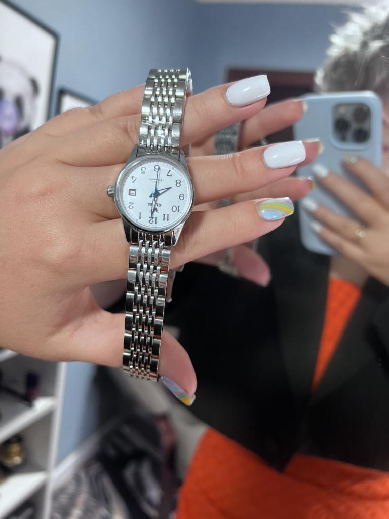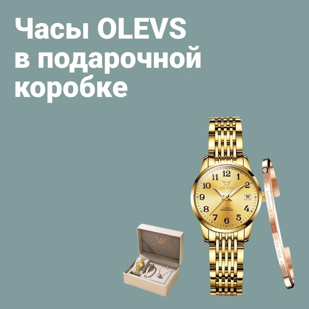 Подарочный набор для женщины от OLEVS🐬 Что входит в набор: 🦋 Кварцевые часы (цвет на выбор); 🦋Золотистый браслет из качественного нержавеющего металла. 🦋Цепочка с тремя подвесками (с камнями, с римскими цифрами и простое колечко). Металл также нержавеющий (как у всего набора). 🔝 Качество проверено - купаюсь и хожу с браслетом и цепочкой уже около месяца, фото сделала сегодня. Никаких признаков носки не появилось. Браслет регулируется по ширине. Более того, все знакомые спрашивают, не из золота ли он/где покупала, и так далее. ☑️ Размеры соответствуют описанным продавцом. Моя рука на запястье окружностью 16,3 см, часы великоваты, но я решила не укорачивать ремешок - ношу их поверх водолазок, рубашек и т.д. Сейчас это актуально, поэтому мне повезло. Ремешок на часах в застегнутом виде - 19,5 см. Часы не отстают и не торопятся - настроила лишь раз - также месяц назад, все отлично. Как подарок - часы просто превосходны! Браслету отдельная любовь. Он вытеснил все мои браслеты из драг. металлов. Покупка того стоит!