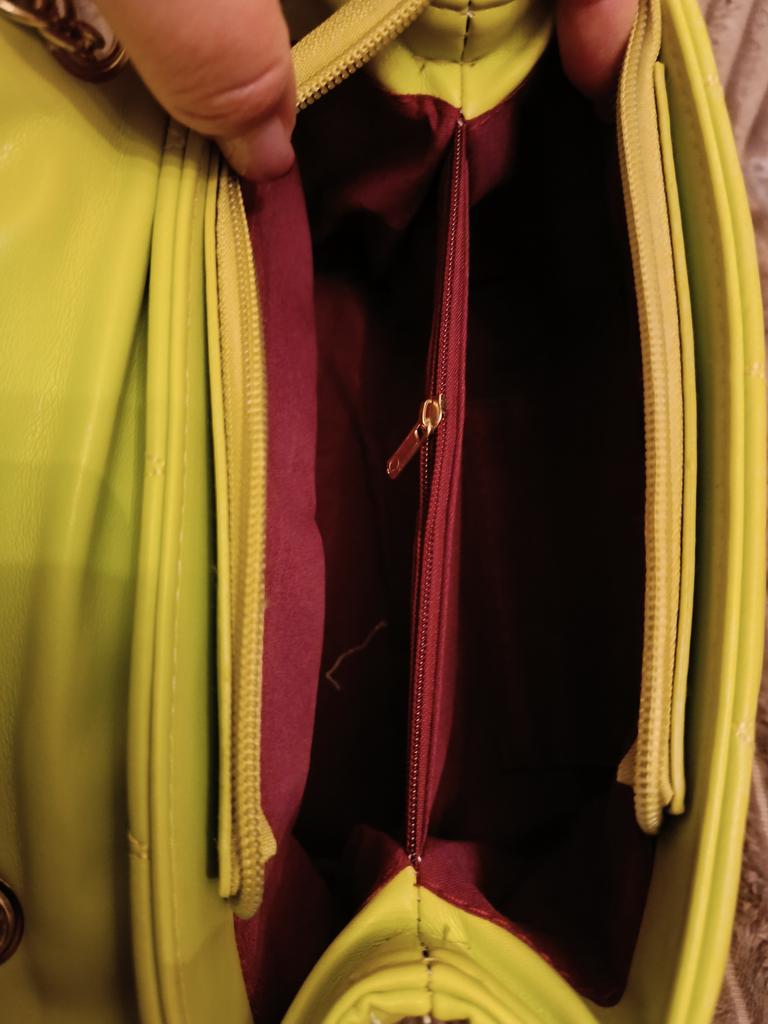Отличная яркая летняя сумка от фирмы Yogodlns. ПУ кожа очень приятная гладкая и мягкая, зелёный цвет полностью соответствует промофото. Сумка хоть и маленькая, но очень даже вместительная. Кошелёк, телефон, футляр для очков, документы, помада, пудра и т.д. всё уместилось Подкладка яркого красно-коричневого цвета, материал плотный типа х/б. Наружного кармана нет, но внутри три отделения, одно из которых на молнии. Цепь довольно длинная. В общем хорошая сумка.
