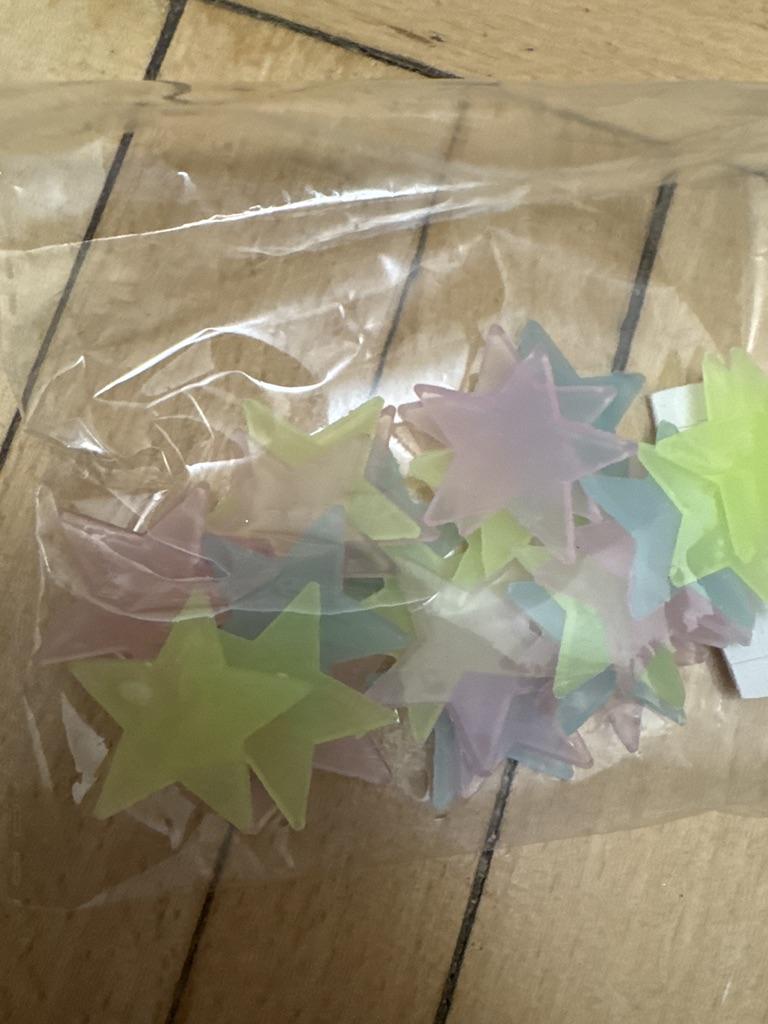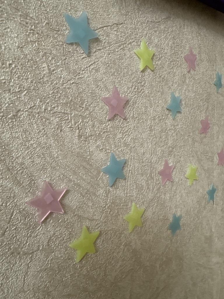 Вообще не светятся, написано что светящиеся наклейки на стены. На самом деле не клеятся, не светятся. Люди, не берите их. Обыкновенные пластмассовые звёздочки.