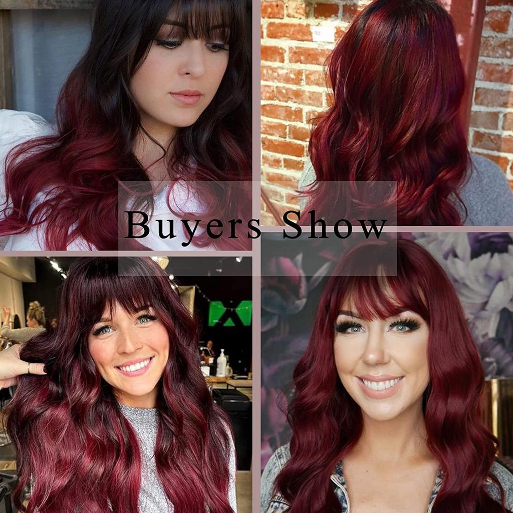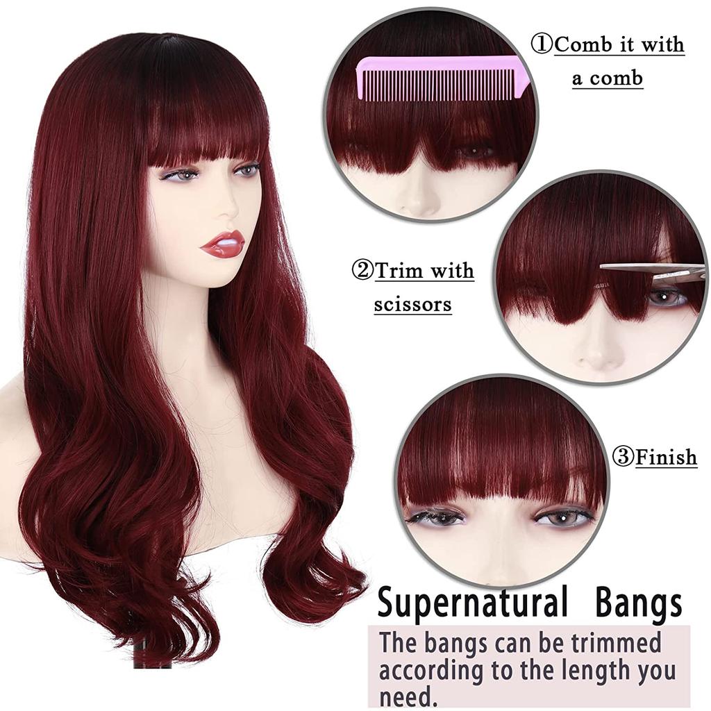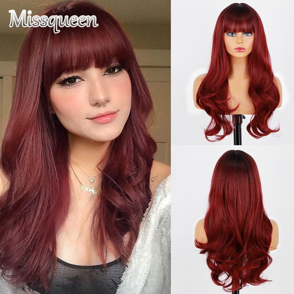 MISSQUEEN Вино Красный Длинный Парик с челкой, Синтетические длинные волнистые бордовые парики для женщин, Натуральные волнистые кудрявые красные парики для ежедневного использования 24 дюйма