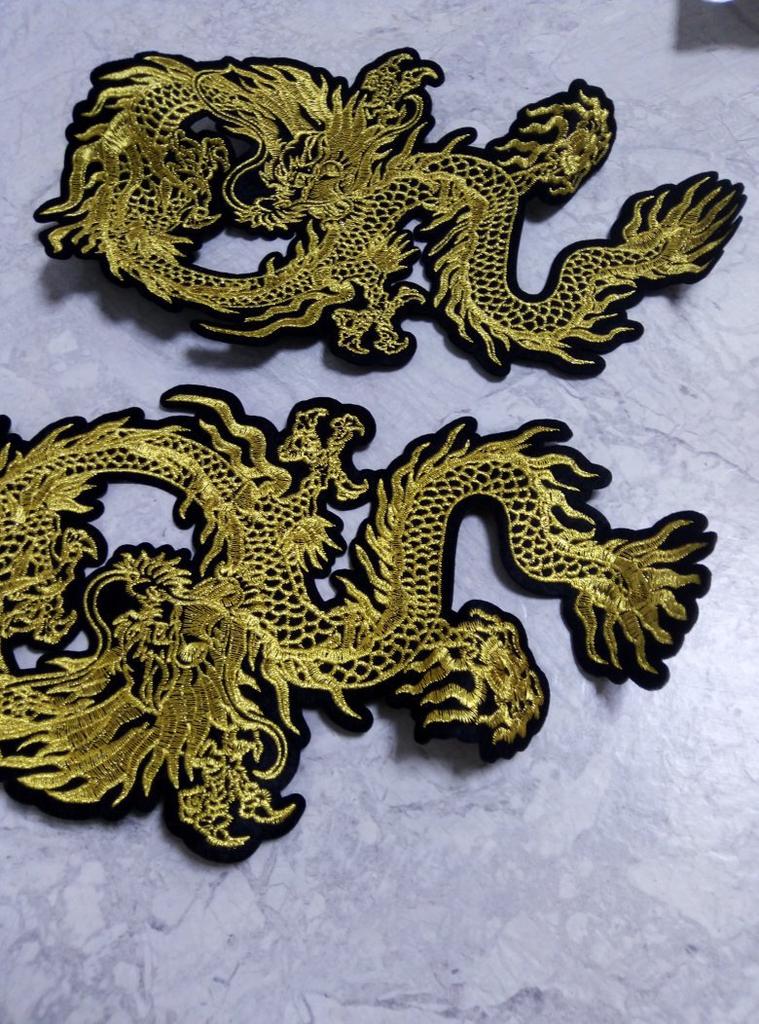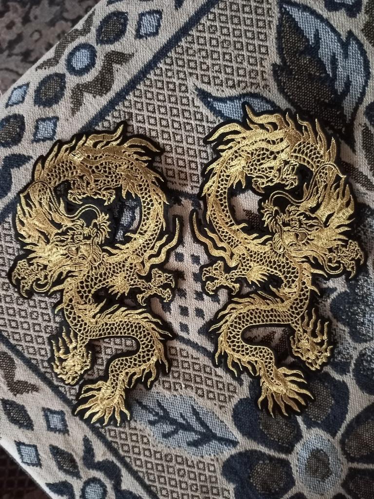 Пришли дракончик, качество достойное нитки не торчат, вышивка на фетре. Размер меня удивил я думала будут маленькие, а они приблизительно 30см на 17см каждый. Я довольна. Пока не приклеевала, но я обычно такие аппликации пришиваю.