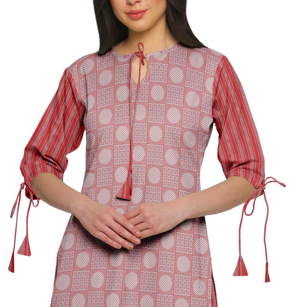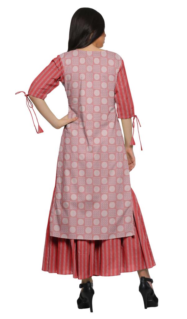 * Разработанный с использованием смешанных принтов, этот комплект Kurta от Moomaya демонстрирует стильную привлекательность. Благодаря длинной прямой курте с вырезом в виде замочной скважины, рукавам с узлом 3 4 и широким брюкам палаццо с эластичным поясом, этот хлопковый комплект курты палаццо мягок на коже и обеспечит вам комфорт в течение всего дня.