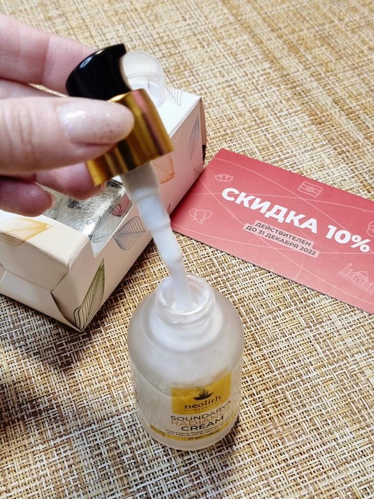 Антивозрастной крем Neolith Saundarya из Индии Крем предназначен для осветления, сокращения морщин, глубокого увлажнения и общего восстановления зрелой кожи. По описанию продавца - на 92% состоит из натуральных продуктов, в том числе экстрактов прополиса, семян подсолнечника, виноградных косточек и корня имбиря, богатых антиоксидантами и витамином Е, что при регулярном применении должно повлиять на эластичность и упругость кожи лица и шеи. Кроме того он защищает от УФ-излучения, фактор SPF 30. Продавец, кажется, учёл все замечания, указанные в предыдущих отзывах: упаковка в картонную коробку и несколько слоёв пупырки сохраняет при транспортировке; коробочка в нежном дизайне с окошком и фирменной наклейкой, защищающей от вскрытия; сам флакон запаян в полиэтиленовую плёнку. И если раньше в отзывах звучали разочарования, то сейчас крем выглядит вполне презентабельно. Флакончик стеклянный, с дозатором, защищенным колпачком. Объем 30 мл, дата изготовления 08.2022, срок годности 24 месяца. Консистенция крема - как у взбитых сливок, но более жирная. Запах довольно выраженный. Для меня первая нота - резкий мужской парфюм, затем при впитывании в кожу раскрываются травяные ноты, аромат становится более приятным, и держится он долго. Впитывается крем без липкой плёнки в течение нескольких минут. Жирного блеска я не заметила. Но из-за запаха и длительного впитывания для утреннего использования он не подойдёт, я буду применять его только вечером. В целом, я довольна покупкой. Хотите экзотики? Рекомендую попробовать. К сожалению, вложенный в посылку промокод на скидку 10% INDIA10, действовал до 31.12 2022. Всегда действующие промокоды на 5-11% в Telegram-канале: followmekanal