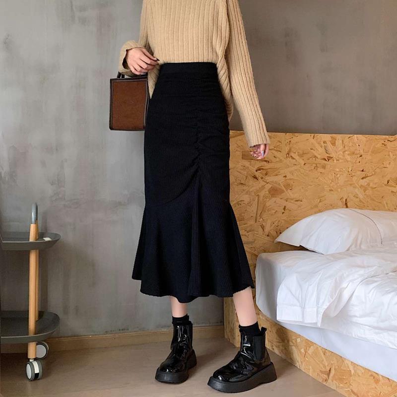 Осенне-весенняя женская тонкая юбка-русалка с рюшами и высокой талией, универсальная однотонная трикотажная расклешенная юбка с запахом на бедрах