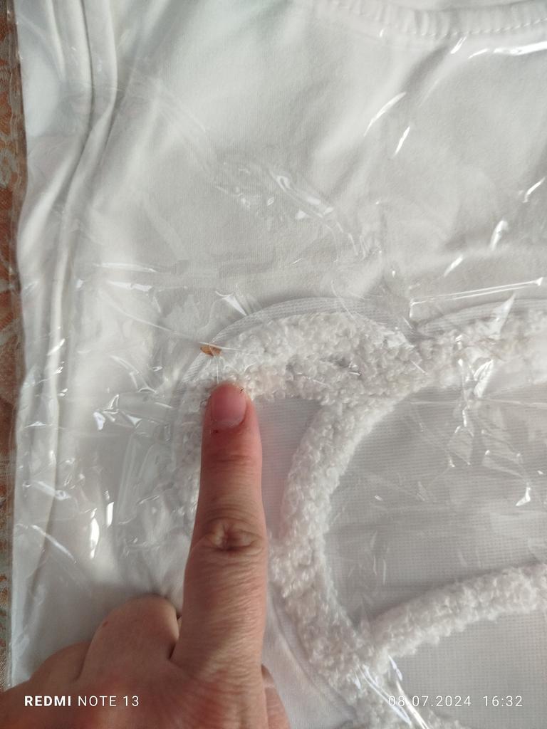 Всë бы ничего, но это плесень, получила посылку а тут такое, картон который был в футболке влажный видимо от него и пошла плесень, не приятненько, сомневаюсь что это отстирается, из плюсов мишка на футболке пришит а не приклеен что радует и прошита прям хорошо никаких ниток нет