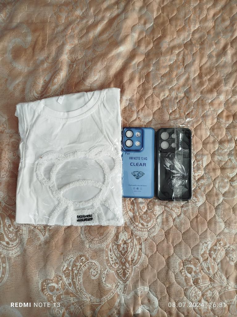 Три товара успокаивали в одну посылку. Заказ пришёл за 17 дней в Республику Татарстан г Казань. Это очень быстро для Джум. Чехлы подошли оба на Редми Нот 13 4 G. Футболка тоже не плохая. Но внутри пакета был мусор. Футболка была не бережно упакована. С краю она вообще вылезла из пакета. Футболка синтетика, так футболка не плохая. Размер XXL на мой 50-52 размер подошла.