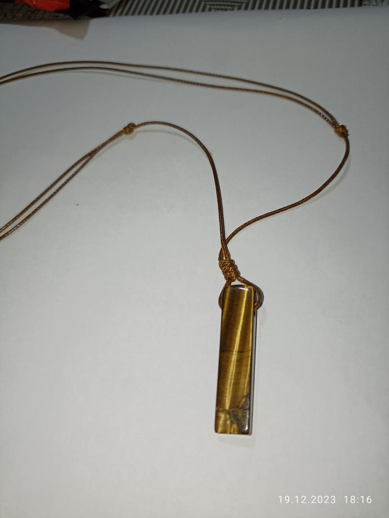 Камень красиво переливается, шнурок шелковый вощёный. По цвету идеально подходит к цвету камня. Размер камня 1 см в ширину, 4 см в длину и примерно 4 мм в толщину. Мне нравится. Спасибо Джуму за доставку. Спасибо мастерам за изготовление. Всех с наступающими праздниками!