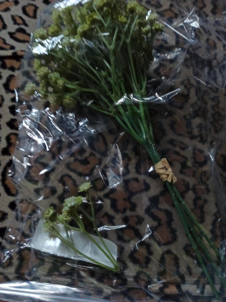 Ну, девочки... Если эту "пышную" гипсофилу добавить в нормальный букет с цветами высотой хотя бы 40 см, то вы ее не разглядите и потеряете. Но.... Раз она мне досталась за рубль, то считаю своим долгом показать её. В присланном пакетике было перемотано 3 веточки вместе. Высота каждой веточки 21 см. В описании товара указано,что гипсофила шёлковая.... Нет!, она пластиковая. Короче, нашелся у меня супер миниатюрный букетик, так вот в нем эта гипсофила вроде и не плохо смотрится.