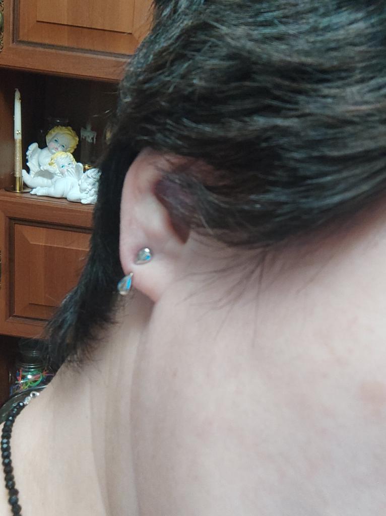 Пришел запакованный, с дополнительными защелками. Но у меня оказался сильно низко прокол, из-за чего нижняя капля сильно висит. Но можно достать отдельную деталь с этой нижней частью и носить просто как обычный гвоздик. В целом миленько