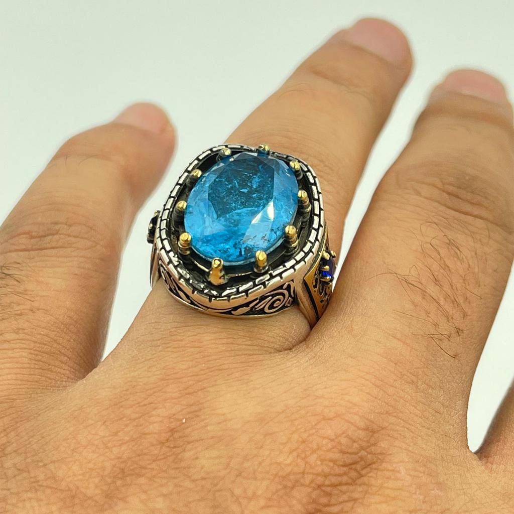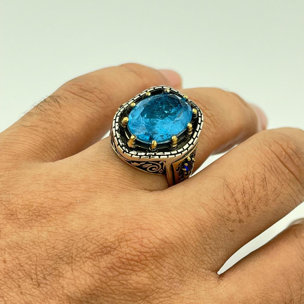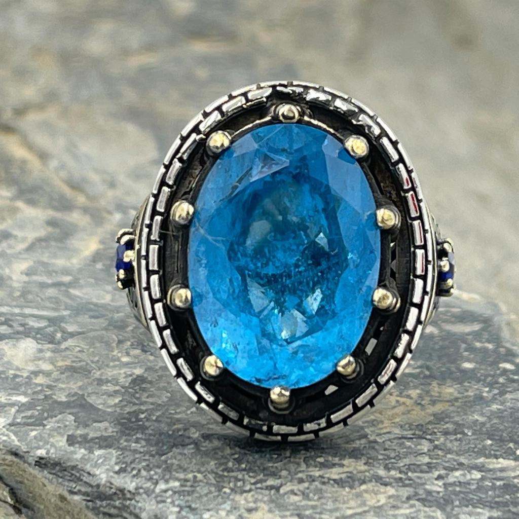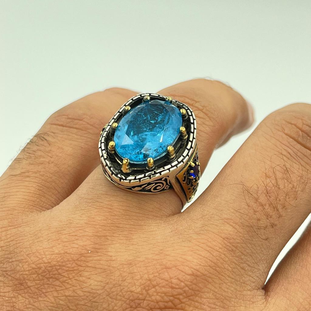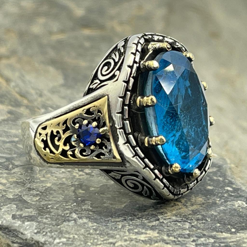 Мужское винтажное серебряное кольцо, кольцо с турмалином параиба, сапфир с боковым камнем, черненое кольцо, мужское кольцо