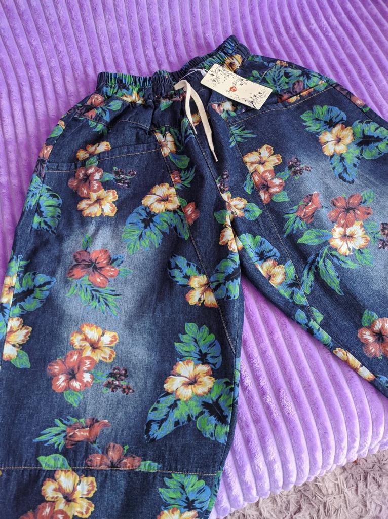 Товар пришел в одной общей посылке с другими заказами (7заказов) Штанишки из тонкой джинсовой ткани, шароварного типа, с множественными рельефными швами и подрезами, с двумя карманами по передней части штанин. Пояс прострочен несколькими строчками, на резинке, с протянутым внутри и выведенным спереди через петли шнуром. Штанины объёмные расширенные в средней части по всей длине и зауженные книзу. Джинсовая ткань черного цвета с печатным цветочным рисунком, мягкая, средняя по толщине. Мои личные впечатления - очень удобно сидят, создают правильный образ и свободу. В поясе не скапливается вся сборка, несмотря на большой объём штанов в области бёдер, и не создаёт лишних толщин в области талии, сидят плотно и надеваются свободно. Я взяла размер L. Мои параметры- рост 156, от- 90, об -104. Возможно, сели бы неплохо и меньшего размера...но что выбрала, то и получила...в общем, я не жалею, т.к я и хотела оверсайз... Ткань дышит и свобода внутри каждой штанины и штанов в целом способствует их н0ске в любой сезон и погоду. Печатный рисунок на ткани не яркий, даже тускловатый, но его размер и распределение всё же создаёт эффект достаточной яркости и нескучности штанишек. Лично я заменила затяжной шнурок в резинке по талии с бежевого цвета, предложенного производителем, на темно красный. Дело вкуса каждого. Рекомендую