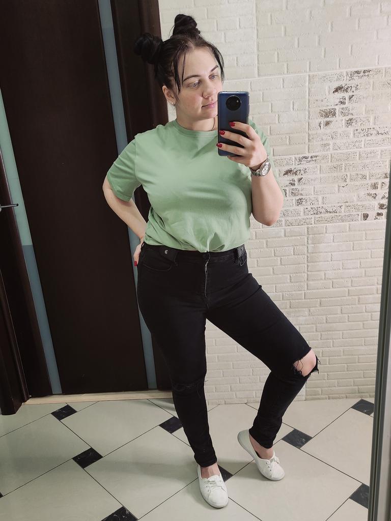Классная хлопковая футболка 💕 В 16 цветах! Цвет просто отпад, плотная, отличной посадки и качества. На мне размер L, рост 160, ог 92, верх ношу 44-46, ближе к 46. Сидит прям как надо, свободно в рукавах и есть воздух между телом и одеждой. На мой вкус лучше в заправленном виде, но длина позволяет носить и на выпуск. Не просвечивает ни темное белье, ни какие-то объемные кружева. На фото продавца цвет более тёмный, у меня чуток светлее, хотя зависит тоже от освещения на фото. На детальном фото она такая же, как и у прода. Я теперь очень хочу голубую ещё ) Доставка до Владивостока около месяца, очень рекомендую!