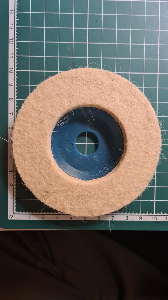 Цена, при покупке в комплексе, адекватная. Основа - пластик, пальцами не проминается фетр плотный, на вид качественный. Размер наружный 100 мм, внутренний 16 мм, толщина общ. 15 мм. См. фото и видео.