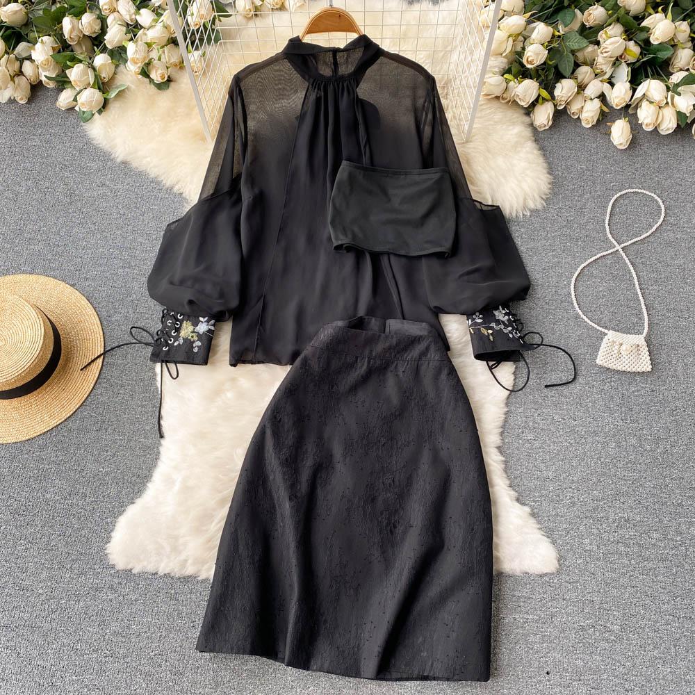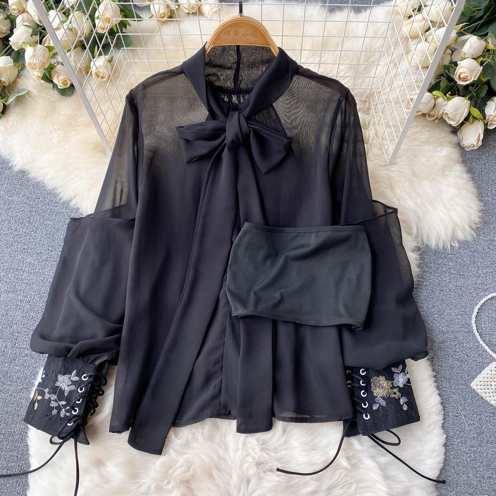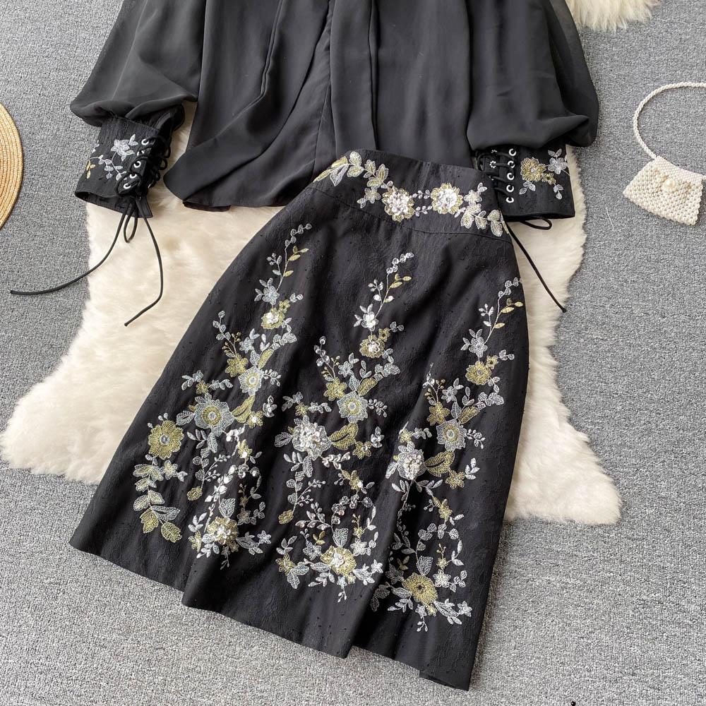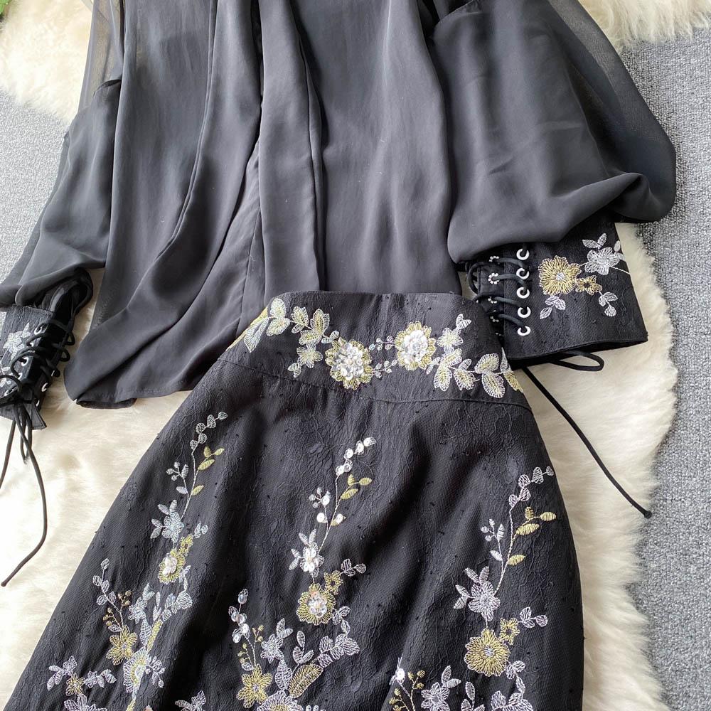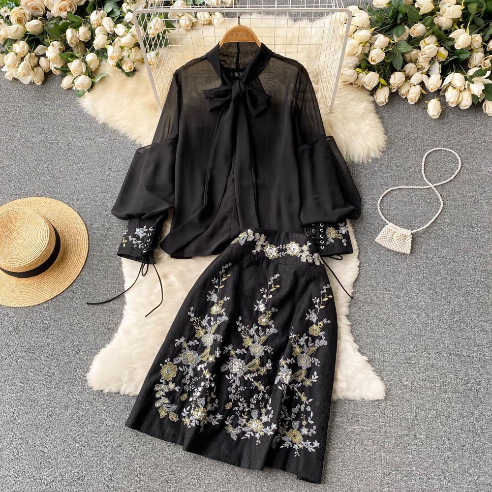 Женская новая модная весенне-осенняя кружевная газовая рубашка с бантом и длинными рукавами, юбка с высокой талией и вышивкой, комплекты из двух предметов
