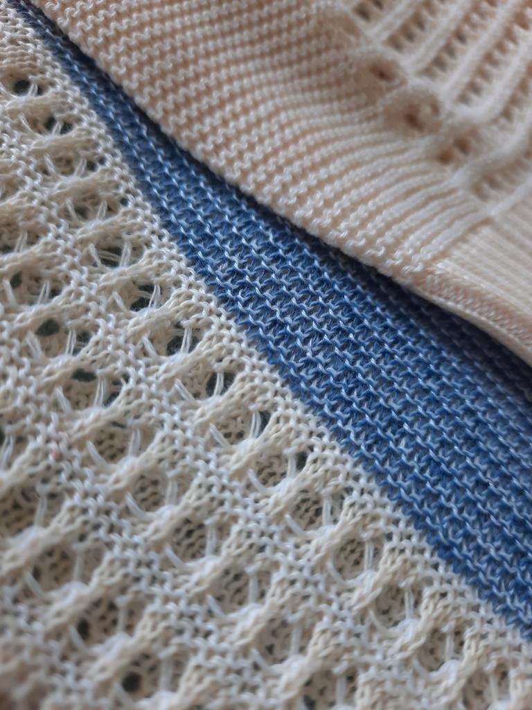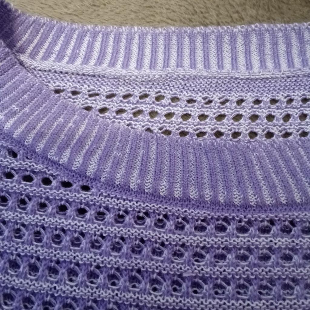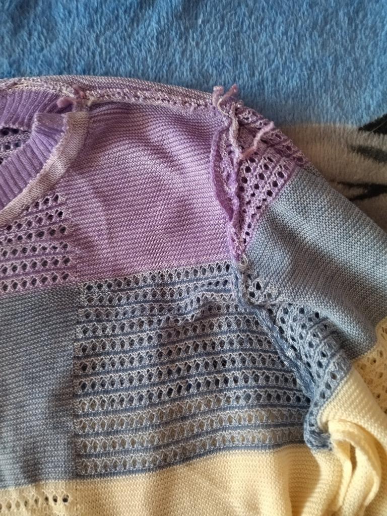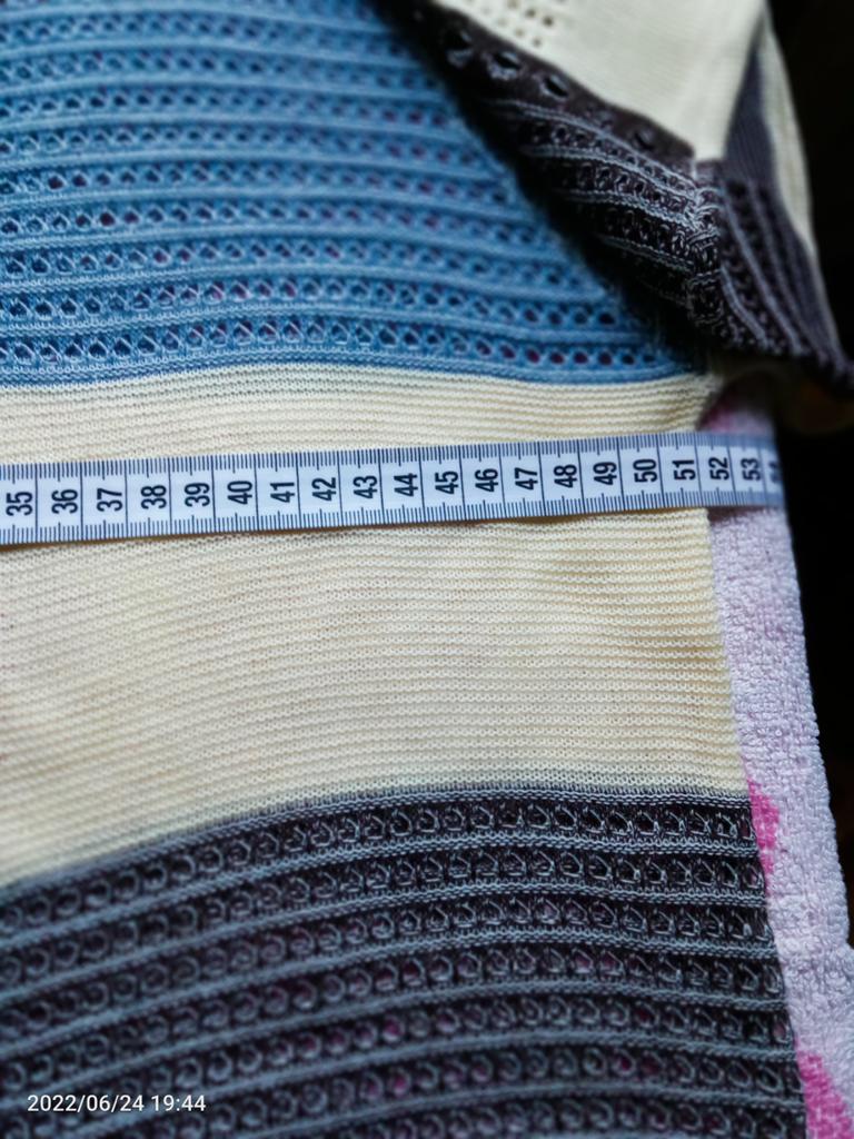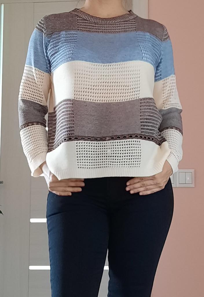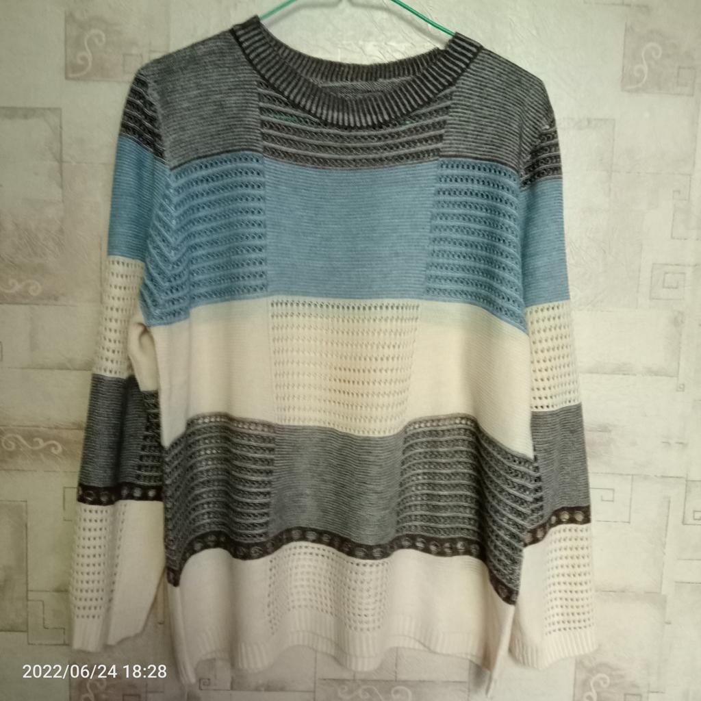 Получила свой свитерок, шёл с 29.06.22, по 10.08.22. Свитер очень тонкой вязки, ажур., цвета синий, сиреневый, кремовый полосками. Вот, если честно, не очень люблю кремовый цвет, смотрится как жёлтый, лучше бы была полоска белого цвета. Заказывала 3хl на 54 размер, всё очень хорошо село по фигуре, единственное - рукава чуть коротковаты, но это потому что у меня руки очень длинные и всегда была проблема с этим. Думаю, постираю, они немножко вытянутся. Главное, что это хбпряжа, нигде ничего не колется. Обработка швов оставляет желать лучшего, на фото видно. Подитоживая всё выше написанное, могу сказать, что носить буду, потому что свитерок скрыл всё недостатки фигуры. Потом постираю и сделаю фото. Спасибо джум! Кстати, посылка пришла с Монголии.