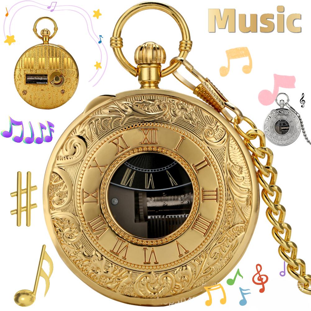 Новые изысканные карманные часы с музыкальным механизмом, музыкальная цепочка для часов с ручной игрой, римские цифры, цепочка с четвертью часа, подвесные часы, новогодний подарок с коробкой
