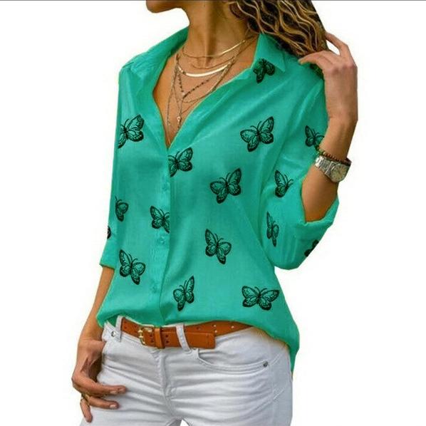 Женская блузка с принтом бабочки, отложной воротник на пуговицах, шифоновые блузки, однотонные топы с длинными рукавами больших размеров