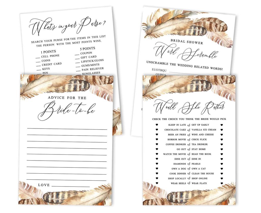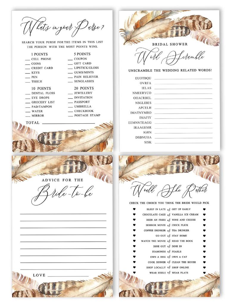 * Набор из 4 игр для свадебного душа, включая карточки с советами для новобрачных, «Что у тебя в сумочке», «Схватка слов для новобрачных», «Вы бы она предпочла».