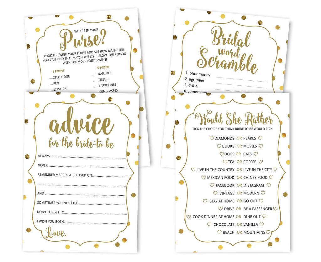 * Набор из 4 игр для свадебного душа, включая карточки с советами для новобрачных, «Что у тебя в сумочке», «Схватка слов для новобрачных», «Вы бы она предпочла».