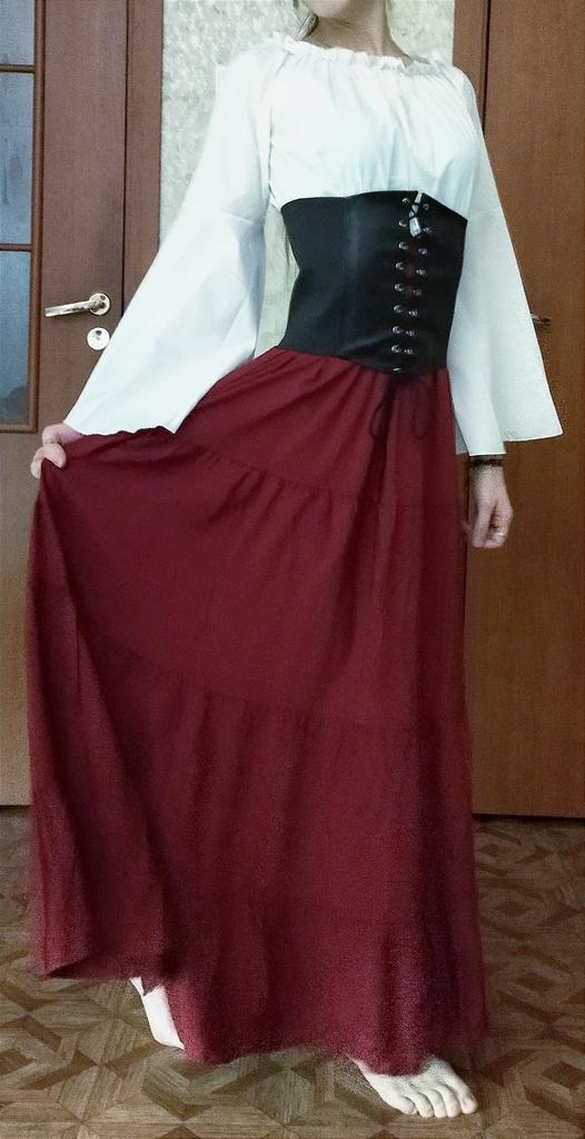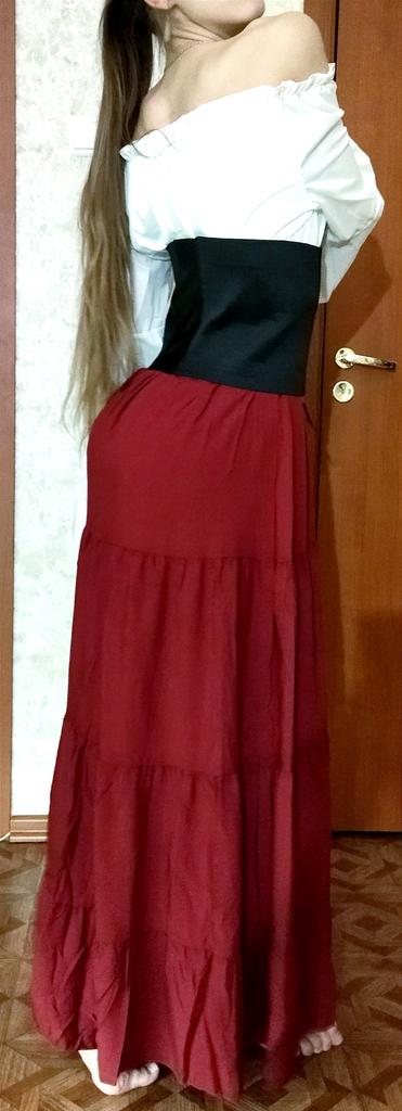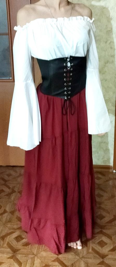 Потрясающее платье! Полностью соответствует описанию и по длине, и по размеру, и по цвету. Ткань полностью хлопковая, лёгкая, приятная. Пошив качественный. Пояс съёмный, сделан из плотной утягивающей ткани со вставками из искусственной кожи. Платье хорошо смотрится, если его носить с закрытыми или с открытыми плечами. Длина подходящая: на рост 170 при размере S закрывает щиколотку. Пояс-корсет не сильно затягивается, на мою талию даже свободен. Его приходится долго шнуровать, так как нет никакой молнии или другой застёжки. Зато пояс можно носить отдельно от платья и дополнить им любой образ так, что совершенно обычные наряды заиграют новыми красками. Последние две фотографии — поэкспериментировала, к какой одежде может подойти этот пояс. Носить платье одно удовольствие: удобно, швы не чувствуются, резиночки дискомфорта не доставляют. Даже снимать не хочется. Такое платье прекрасно будет сидеть на женщине любого телосложения.
