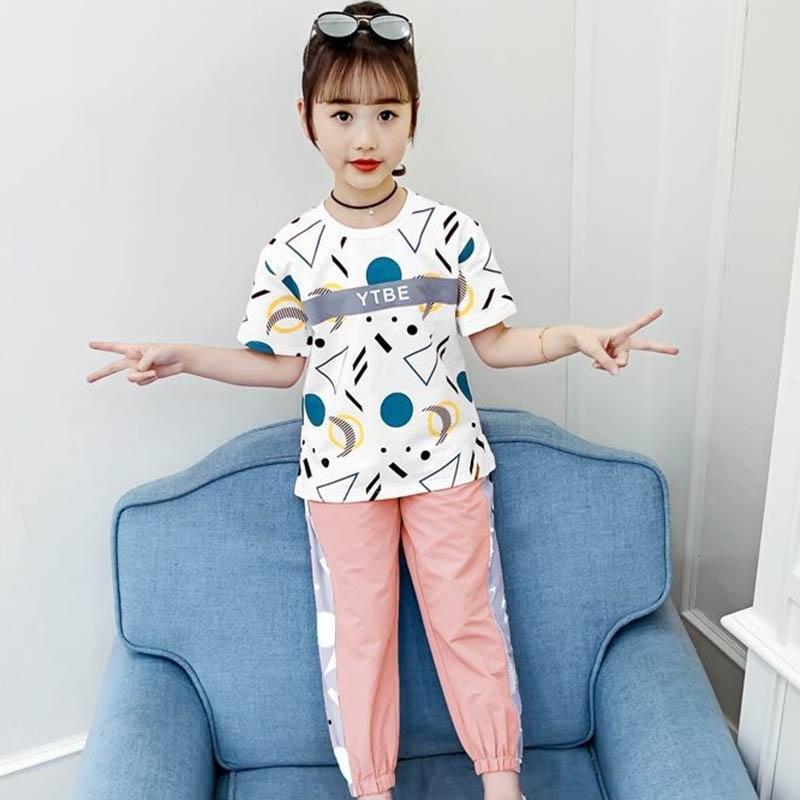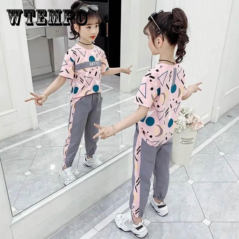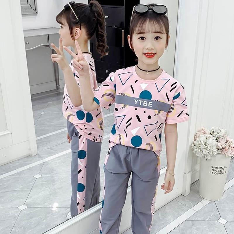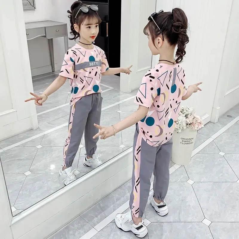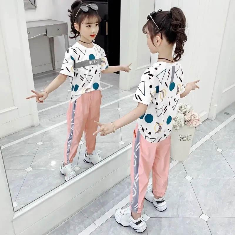 Костюм для девочек, летняя спортивная одежда для отдыха, свободная и дышащая детская одежда, брюки с короткими рукавами для девочек, универсальный комплект из двух предметов с принтом букв