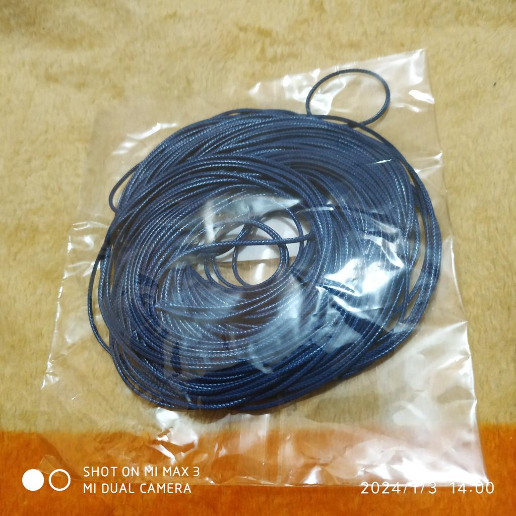 Доставка посылки месяц, в посылке семь заказов. Вощеный хлопковый шнур, всё как заказывал соответствует описанию 1мм, длина 15 метров, тёмно-синий цвет, очень прочный. Только одно но, что этот шнур не на бобине, как показано на рисунке, запутывается. Спасибо большое продавцу и Joom за доставку.