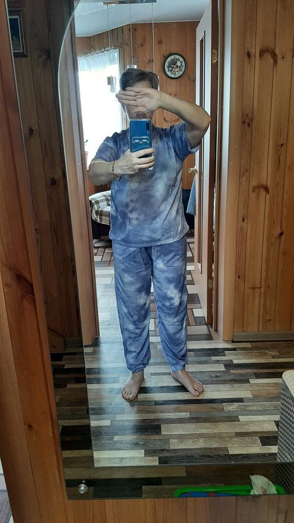 Костюмчик шикардосный, я ношу 50 размер, заказала (по отзывам) 3XL и не прогадала, фактически я должна в нём болтаться, но нет, подошёл в самый раз, чуть меньшего размера был бы мал. Ткань синтетика, не тонкая, но лёгкая и невесомая, пошив хороший, конечно ниточки торчат кое где, но это не критично. К стирке будет само то, на штанишках есть кармашки, в общем мне понравился, не жалея, что заказала. Благодарю Джум.