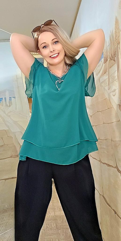 Сама блузка к телу приятная,качество не плохое,но думаю материал мнущийся.Я ношу размер 48-50,заказала XXXXL-в груди хорошо,по бедрам очень широко.Получается блузка для беременных.Пришлось ушить с двух сторон по 5 см.Теперь все отлично:хоть с юбкой,хоть с брюками.