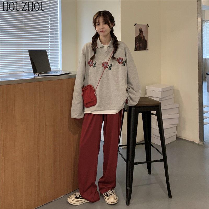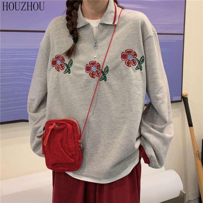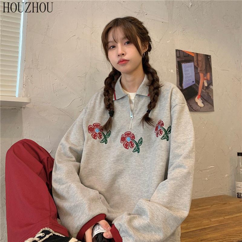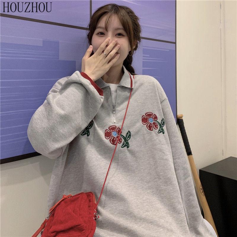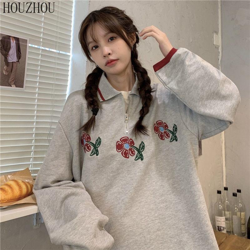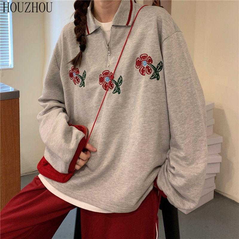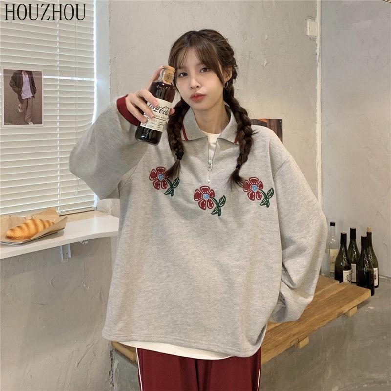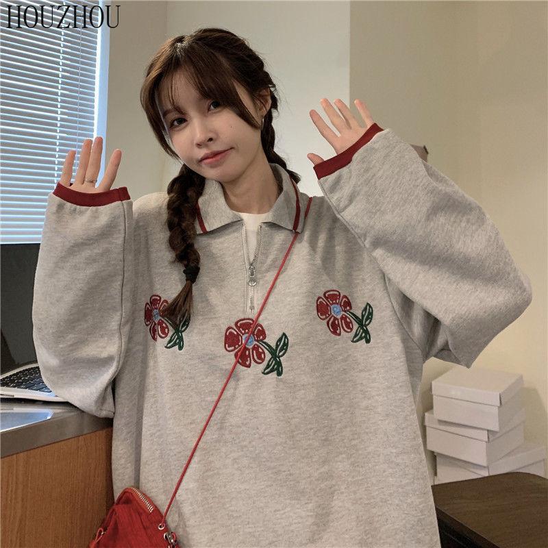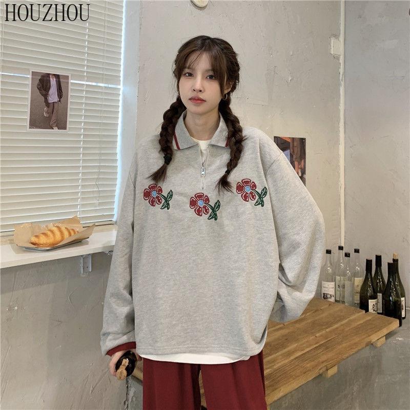 HOUZHOU Толстовки-поло женские с цветочным принтом и длинным рукавом, винтажные корейские большие размеры, свободные Ins для студентов, шикарный тренд