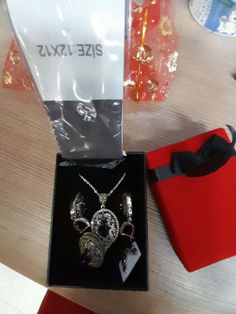 Комплект очень красивый, я довольна, упакован в красивую коробочку. Отдельное спасибо за подарки, сережки гвоздики в виде сердечек и тряпочку для чистки украшений. В живую даже красивее, чем на фото. Заказ пришел быстро, 9.11 заказала,23.11 получила.