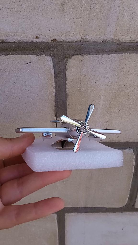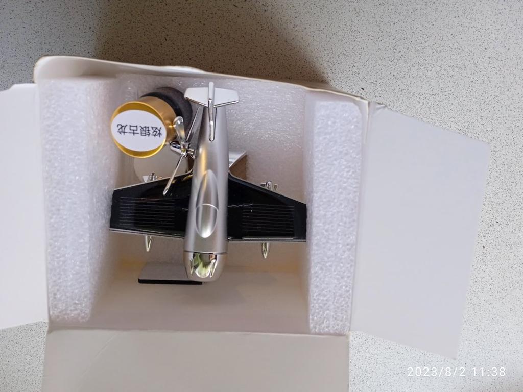 По коробке с товаром наверное проехал грузовик! Вся помятая! Хорошо, что самолетик не пострадал, внутри заводской коробки были поролоновые стенки. Выглядит красиво, сделан качественно, на солнце начинает вращаться пропеллер)) в комплекте пузырек с ароматическим маслом, пипетка и резиновая нескользящая подложка, если не хотите приклеивать его на 2-сторонний скотч. Товар отличный, упаковка и доставка - нет!