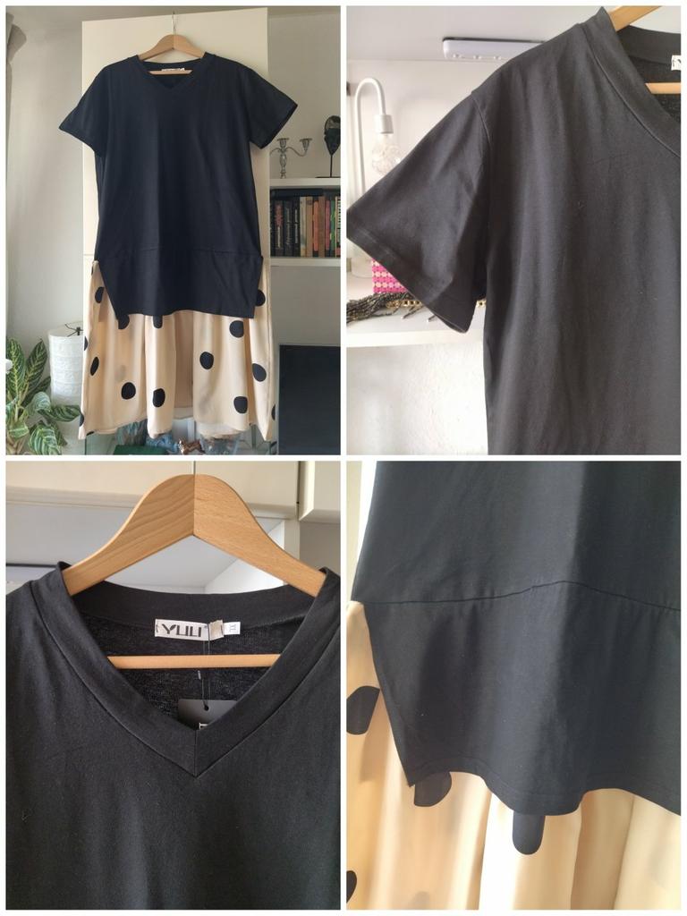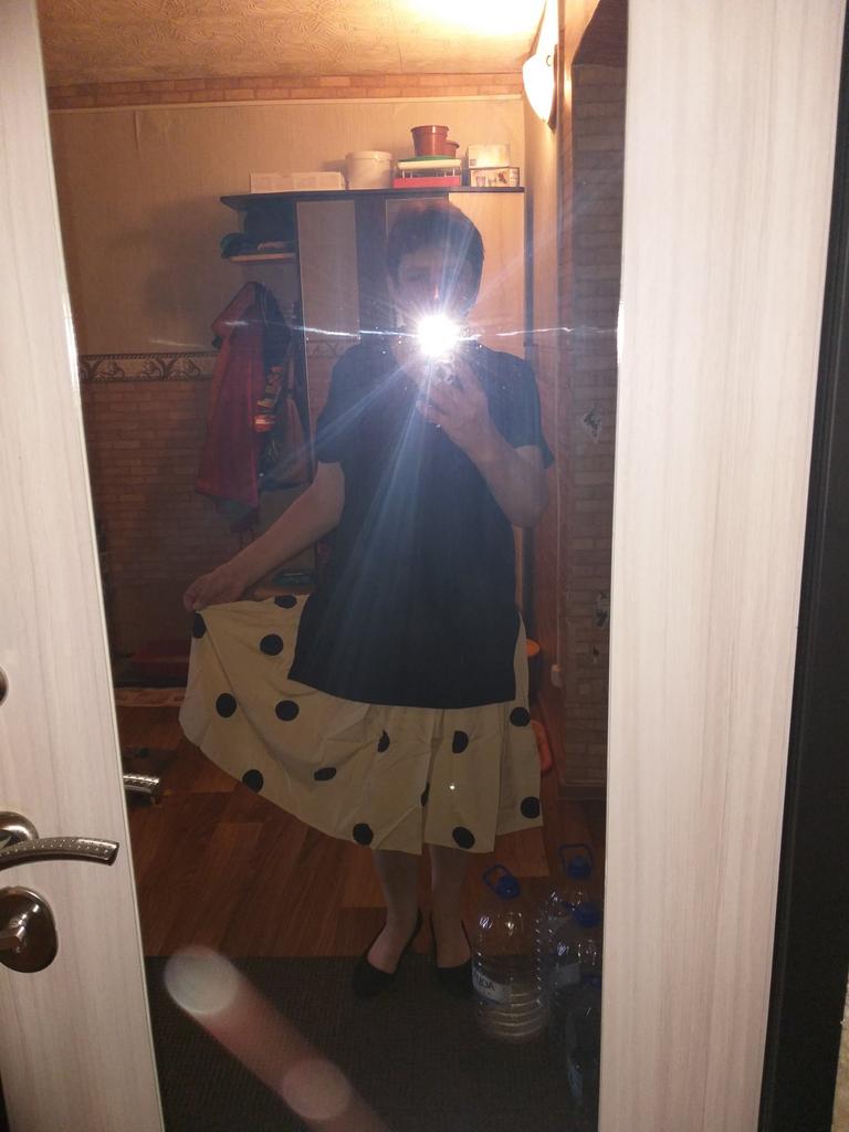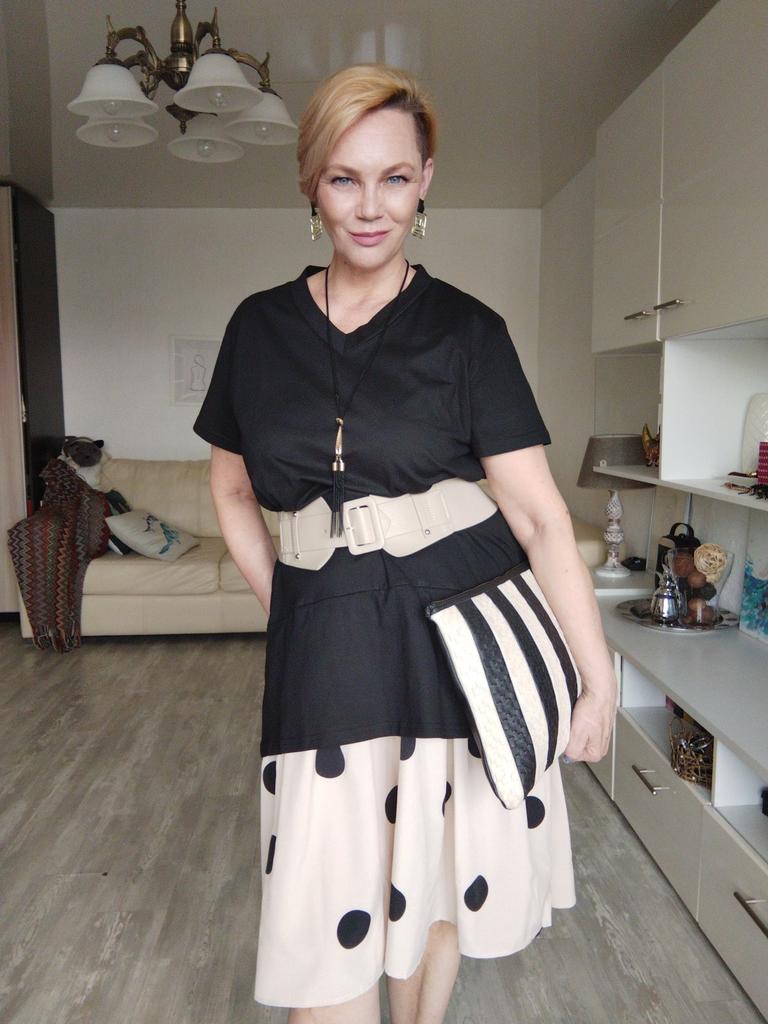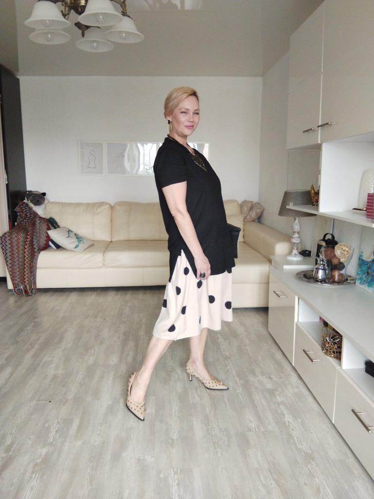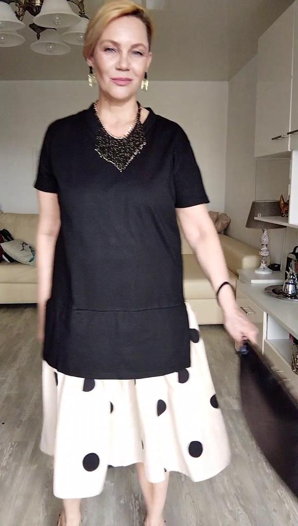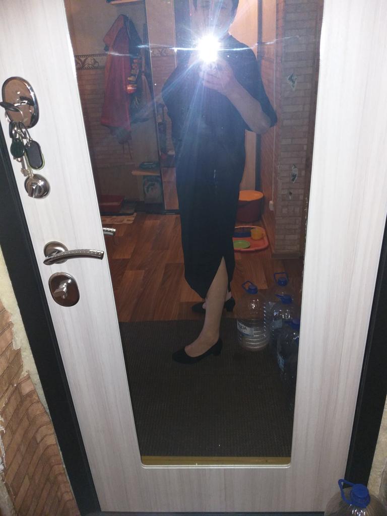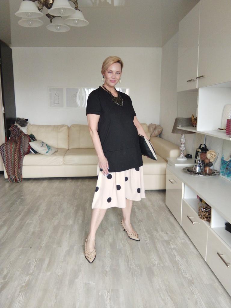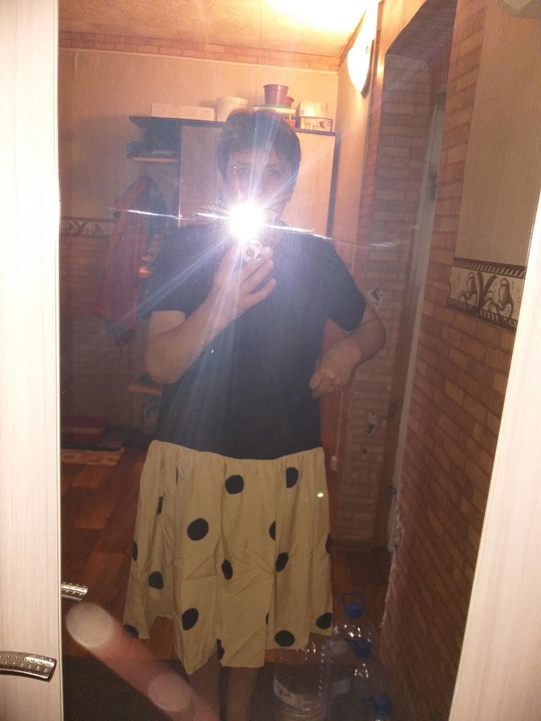 She's a lady) Интересное платье. Иногда мне кажется, что Диманаф сам не понимает, какие гениальные модели вещей он производит). Концепция его одежды, с одной стороны, проста, с другой стороны, каждое его изделие имеет щедрую горсть изюма: всегда есть интересная , отличительная особенность. К примеру, это платье. Верх: простая, удлиненная черная футболка с V- образным вырезом, с пришитым к ней подолом контрастного цвета, в крупный горох. Материал подола, скорее всего, смесовый. Плотный, слегка шелковистый. Полагаю, синтетика. Все вместе, при правильно подобранной бижутерией, обувью и аксессуарами, создаёт интересный образ. Платье представлено у продавца в единой расцветке, размерный ряд L-3XL. На мне XL. Мой рост 167, параметры 98-87-101. Платье село нормально, если бы взяла на размер больше, тоже было бы хорошо. Замеры ОГ 114 Плечи 45 Длина рукава 17 Ширина рукава 16 Длина 106 Пошив фабричный. Платье рекомендую.