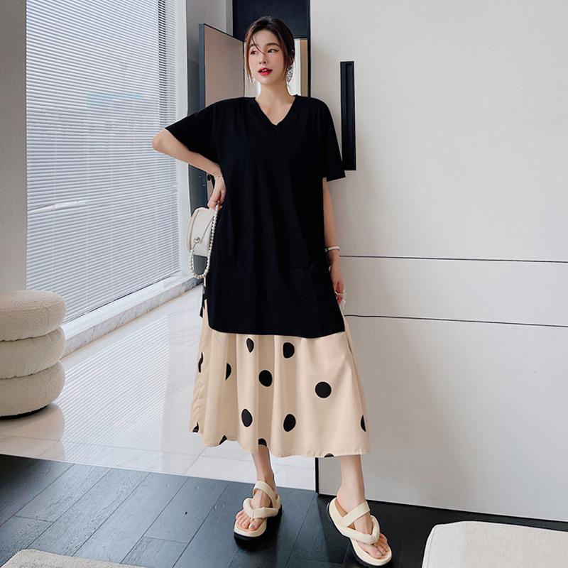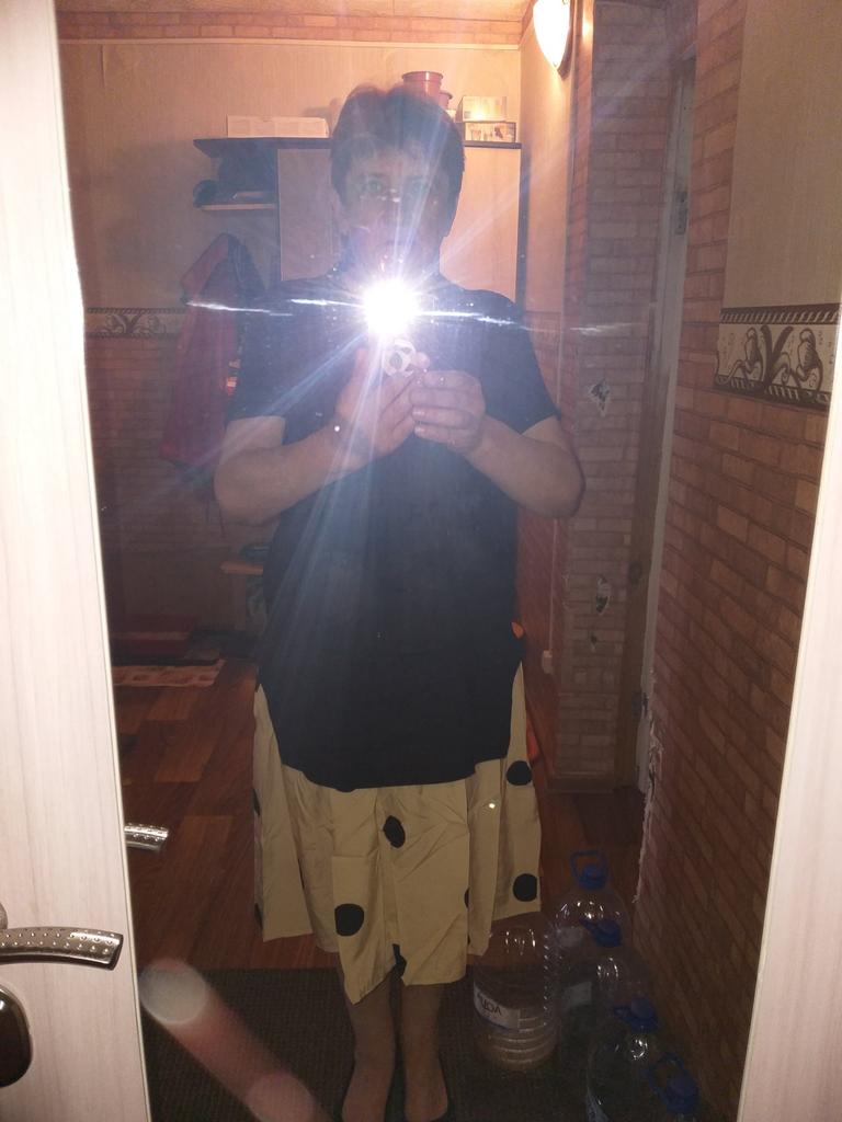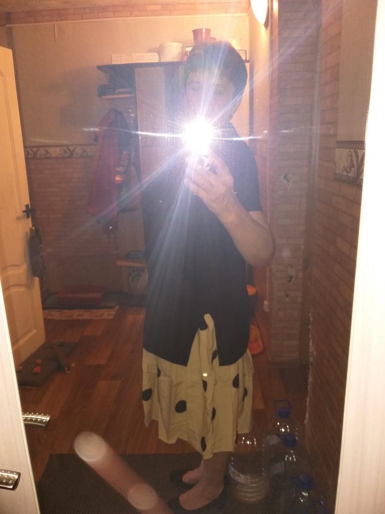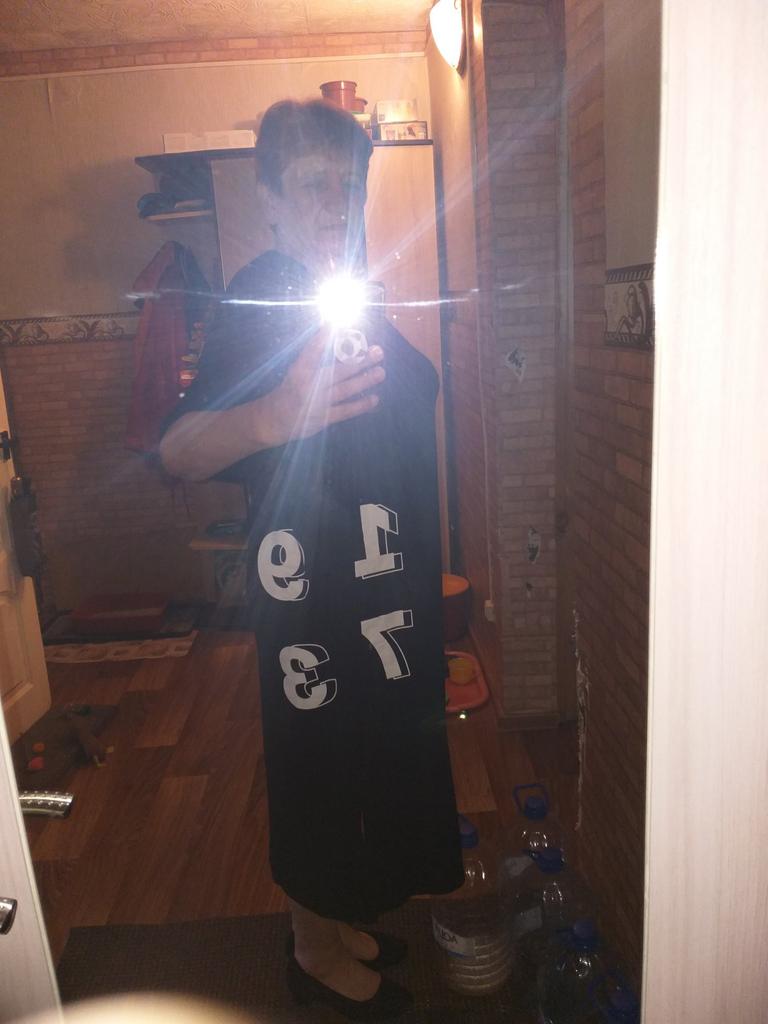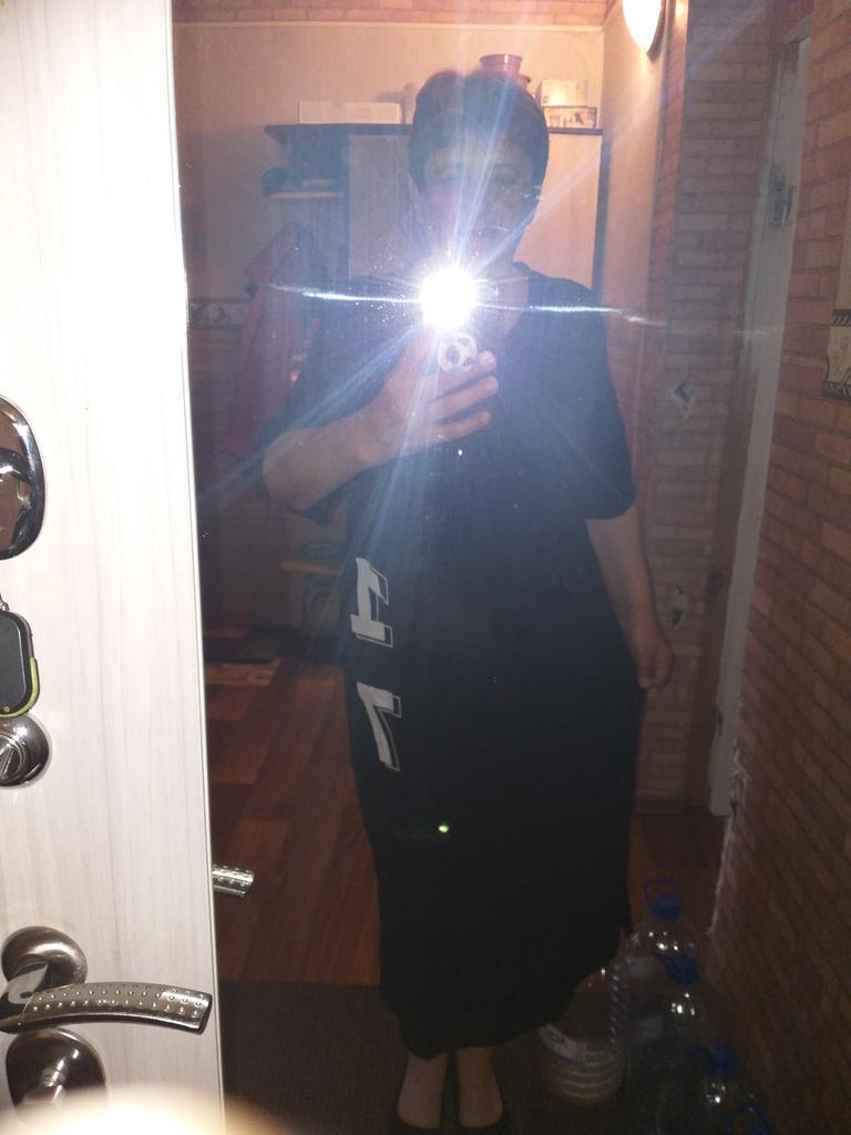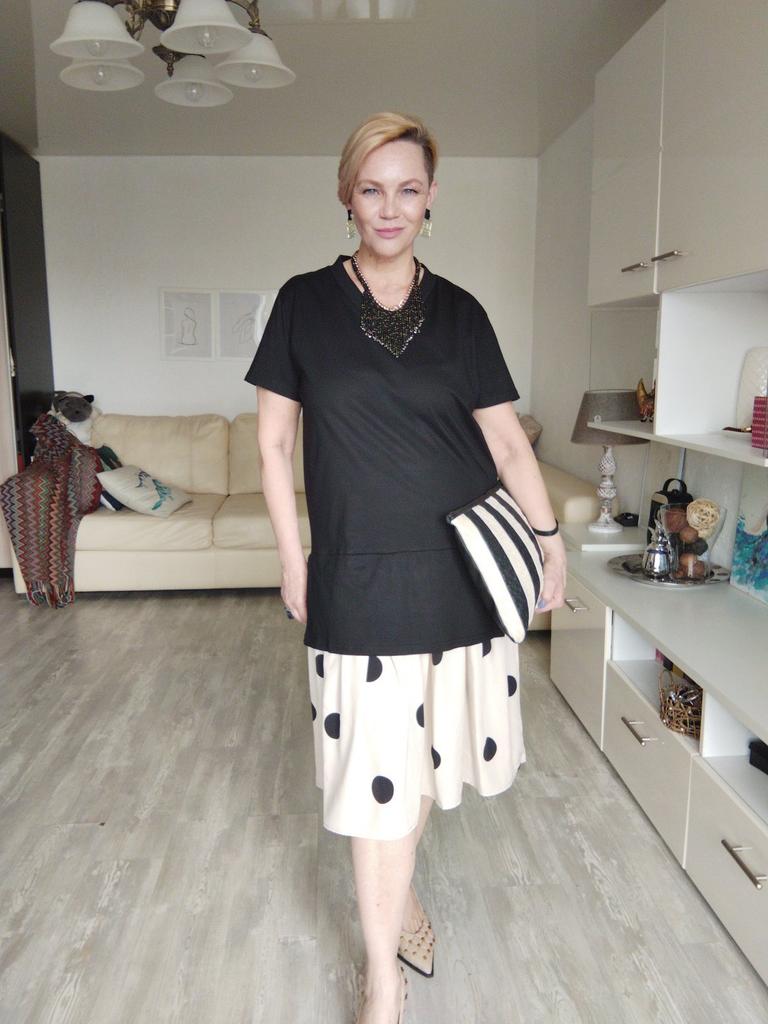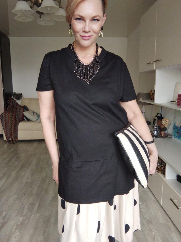 She's a lady) Интересное платье. Иногда мне кажется, что Диманаф сам не понимает, какие гениальные модели вещей он производит). Концепция его одежды, с одной стороны, проста, с другой стороны, каждое его изделие имеет щедрую горсть изюма: всегда есть интересная , отличительная особенность. К примеру, это платье. Верх: простая, удлиненная черная футболка с V- образным вырезом, с пришитым к ней подолом контрастного цвета, в крупный горох. Материал подола, скорее всего, смесовый. Плотный, слегка шелковистый. Полагаю, синтетика. Все вместе, при правильно подобранной бижутерией, обувью и аксессуарами, создаёт интересный образ. Платье представлено у продавца в единой расцветке, размерный ряд L-3XL. На мне XL. Мой рост 167, параметры 98-87-101. Платье село нормально, если бы взяла на размер больше, тоже было бы хорошо. Замеры ОГ 114 Плечи 45 Длина рукава 17 Ширина рукава 16 Длина 106 Пошив фабричный. Платье рекомендую.
