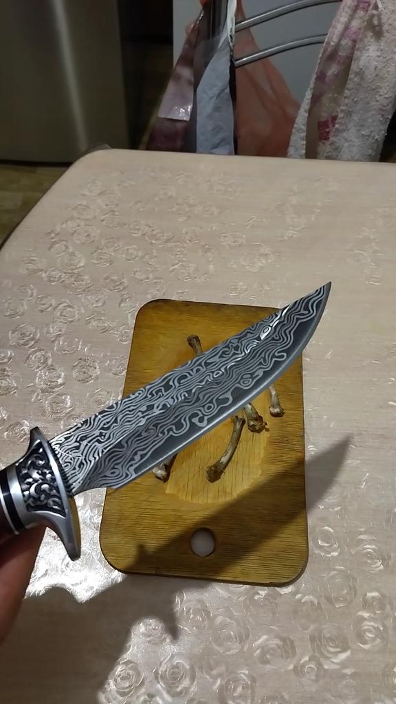 Заказ пришел в Уссурийск за две недели, это плюс!!! Лезвие по факту 165мм, рукоять под очень большую руку (у меня не маленькая, но ещё один палец поместится). Рисунок на лезвии- просто напыление матовой краской... Пока острый, твердость пока не проверил... обух 3,5 мм, вес 265 грамм,.. в общем доволен¡!!