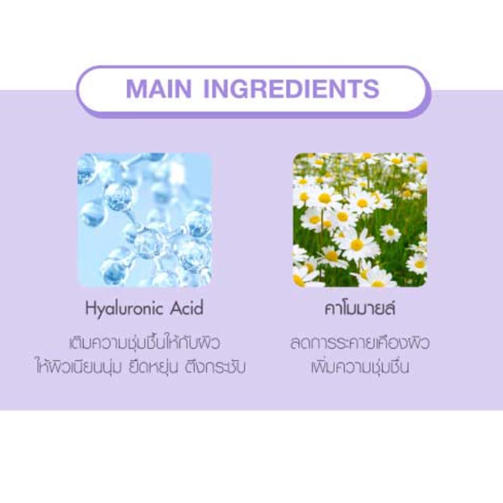 Мягкая очищающая формула для мягкой, гладкой и упругой кожи с гиалуроновой кислотой, которая помогает удерживать влагу для внутренней кожи. Помогает разгладить, подтянуть и экстракты из цветков ромашки, которые уменьшают раздражение и смягчают кожу. и с небольшой молекулой мясной подушки Может глубоко очистить кожу. Помогает удалить макияж, жир и пыль, а также анти-загрязненные вещества, которые защищают кожу от внешних загрязнений.