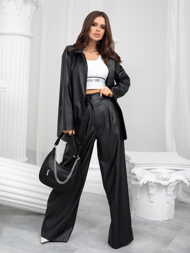 Черный свободный костюм из эко-кожи ISSA Plus