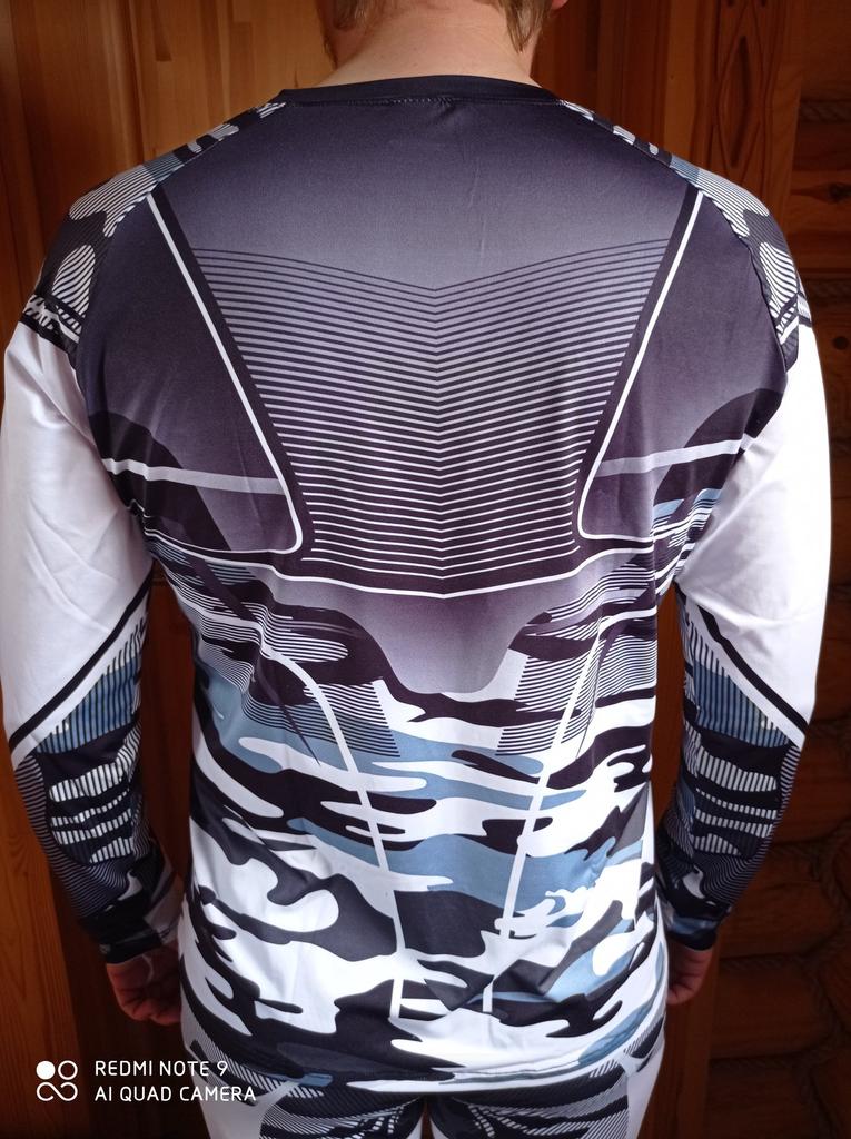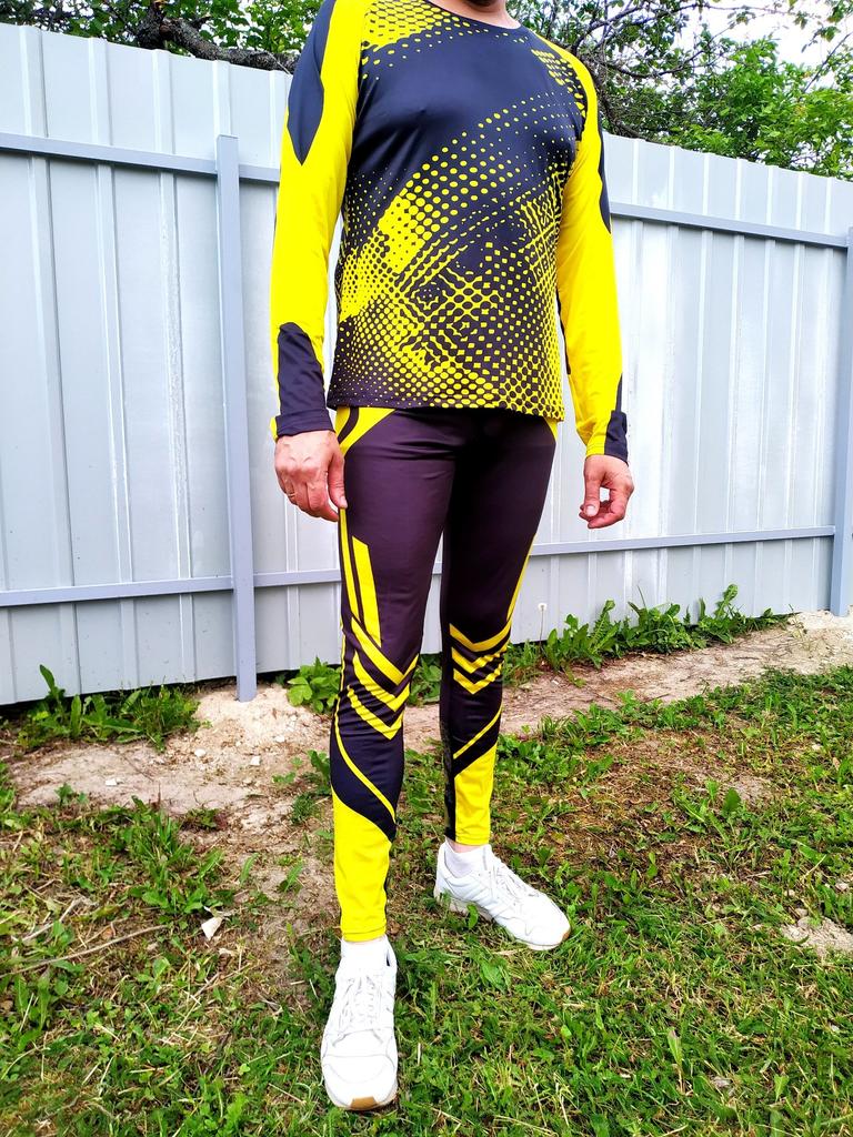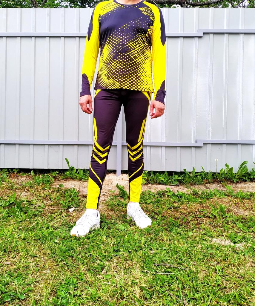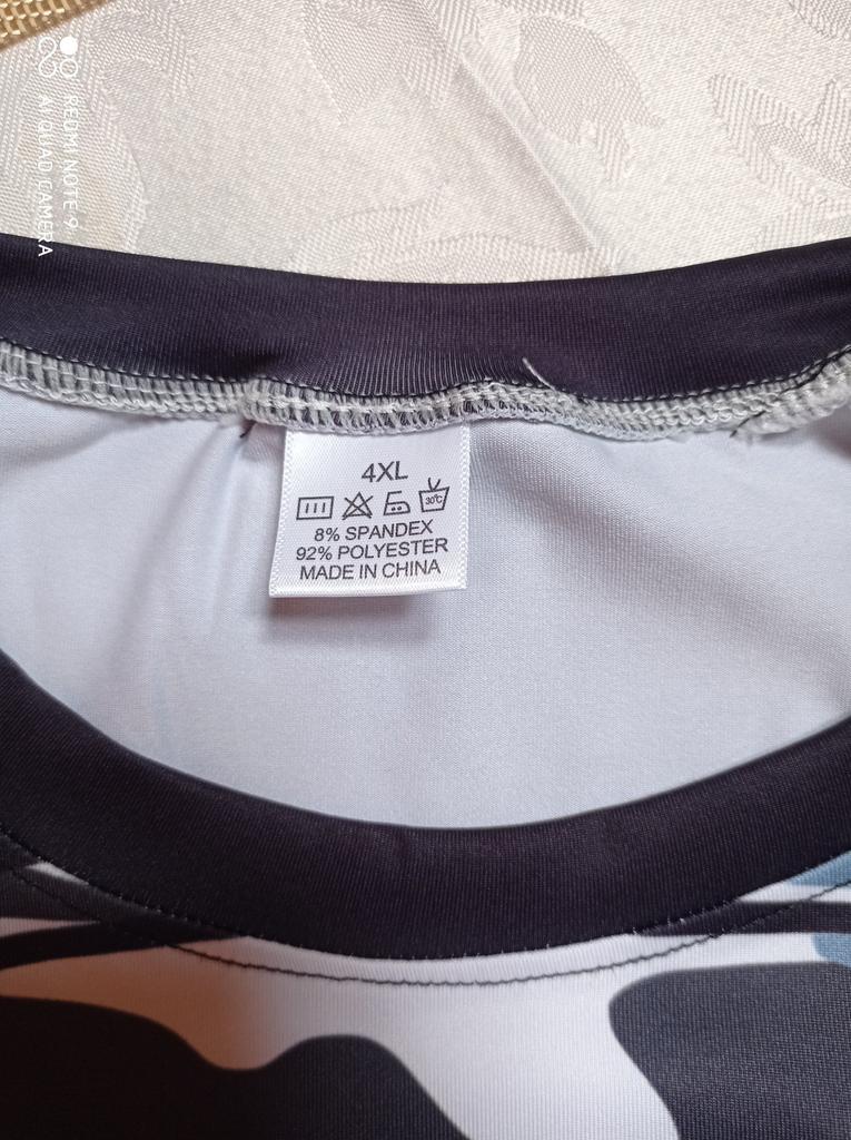 Спортивный мужской костюм На российский 48 взяли 4XL, сел хорошо, как раз! Очень хорошо тянется. Быстросохнущая приятная к телу ткань. Продавец утверждает, что рисунок не выцветает. Возможно. Посмотрим 😊 Подобные костюмы носят под шорты. Он будет особенно удобен во время пробежки 👍 Материал - 92% полиэстер, 8% спандекс. Швы ровные, нитки не торчат. Изделие фабричное. Продавец предлагает большое количество различных расцветок костюмов. Доставлен в почтовое отделение за 1,5 месяца живым треком в сборной посылке. Товар и продавца рекомендую 👍