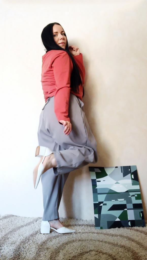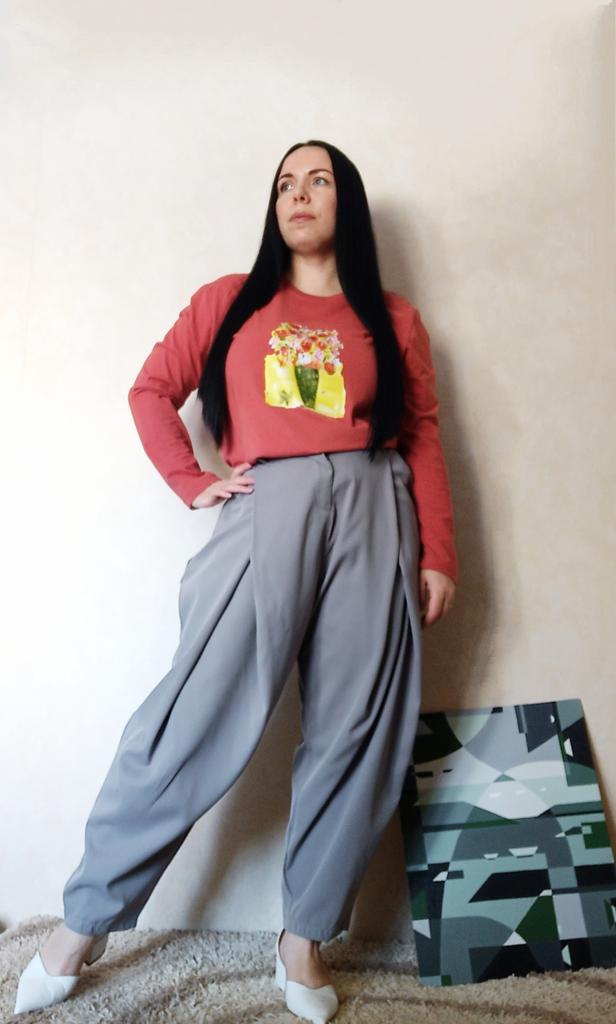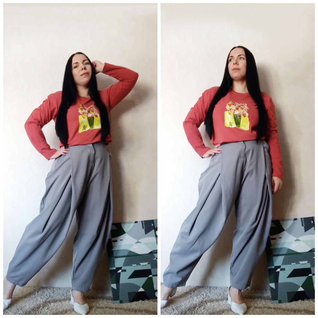 Брюки на рост 179 короткие, на 7/8 или меньше, но свободные потому, что ради бОльшей длины я взяла брюки большего объема бедер. И потому это теперь требует доработки, так как складки раскрываются не по колену , а больше на боку. Я поняла , что надо прошить выточки спереди на животе и тогда складки сместятся ближе к центру, и будут смотреться очень интересно, как раскрывающийся бутон тюльпана ...а при сгибании колена складки будут расправляться, "бутон" брючины словно раскрываться. Мне брюки коротки. В исходном виде смотрятся как китайский народный крестьянский костюм , и формирует вместо ног колесо, раскрывая складки вбок))) надо подгонять под себя. Но в целом задумка очень интересная, выкройка непростая.